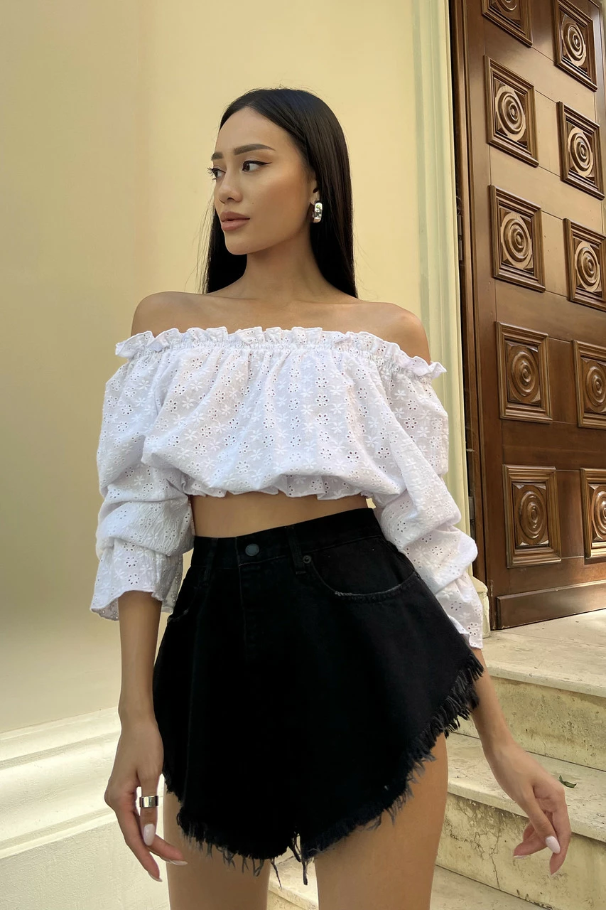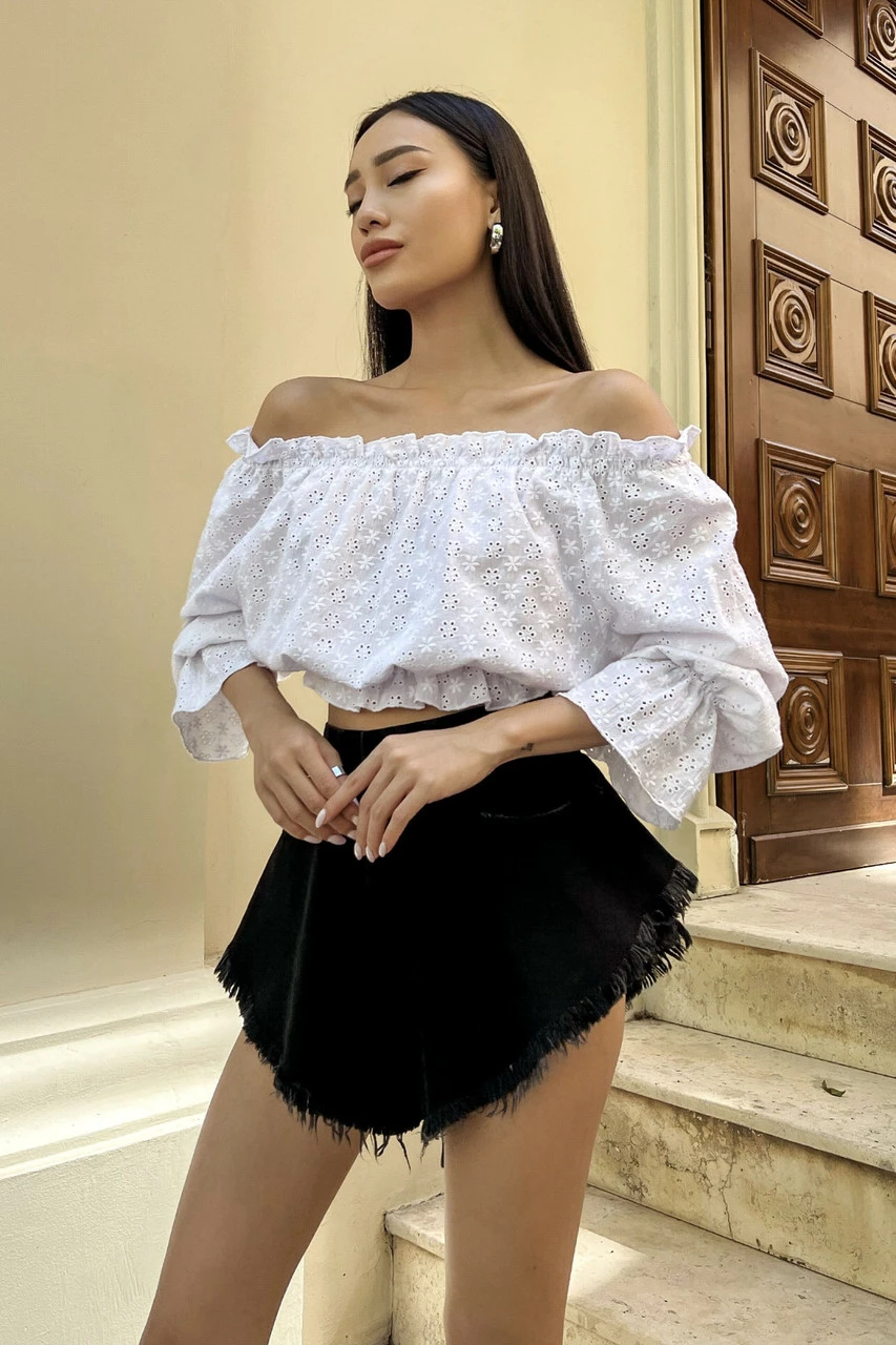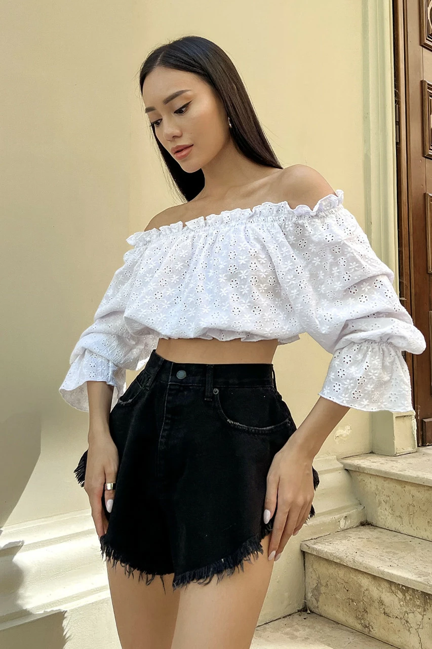 Трендова блуза укороченого крою, виготовлена із прошви у білому кольорі. Модель відрізняється глибоким вирізом-човном з еластичними вставками, що дозволяє відкривати плечі. Ефектний довгий рукав з воланом та декор рюшами – одні з найактуальніших деталей SS22.