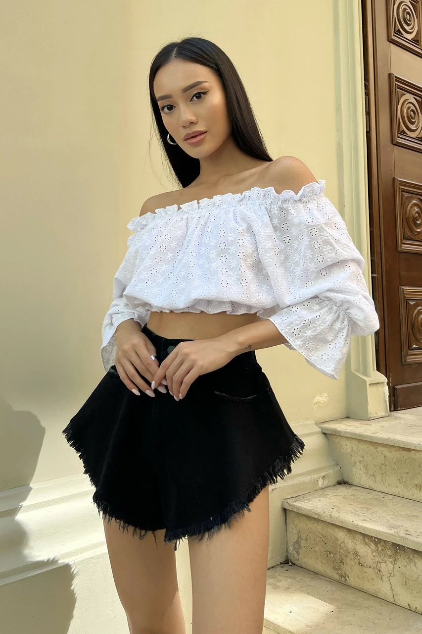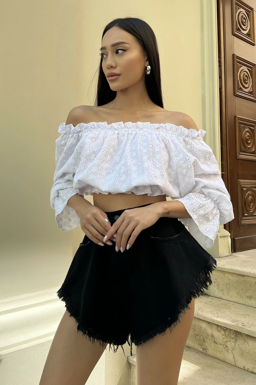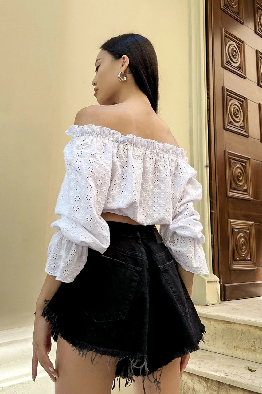 Трендова блуза укороченого крою, виготовлена із прошви у білому кольорі. Модель відрізняється глибоким вирізом-човном з еластичними вставками, що дозволяє відкривати плечі. Ефектний довгий рукав з воланом та декор рюшами – одні з найактуальніших деталей SS22.