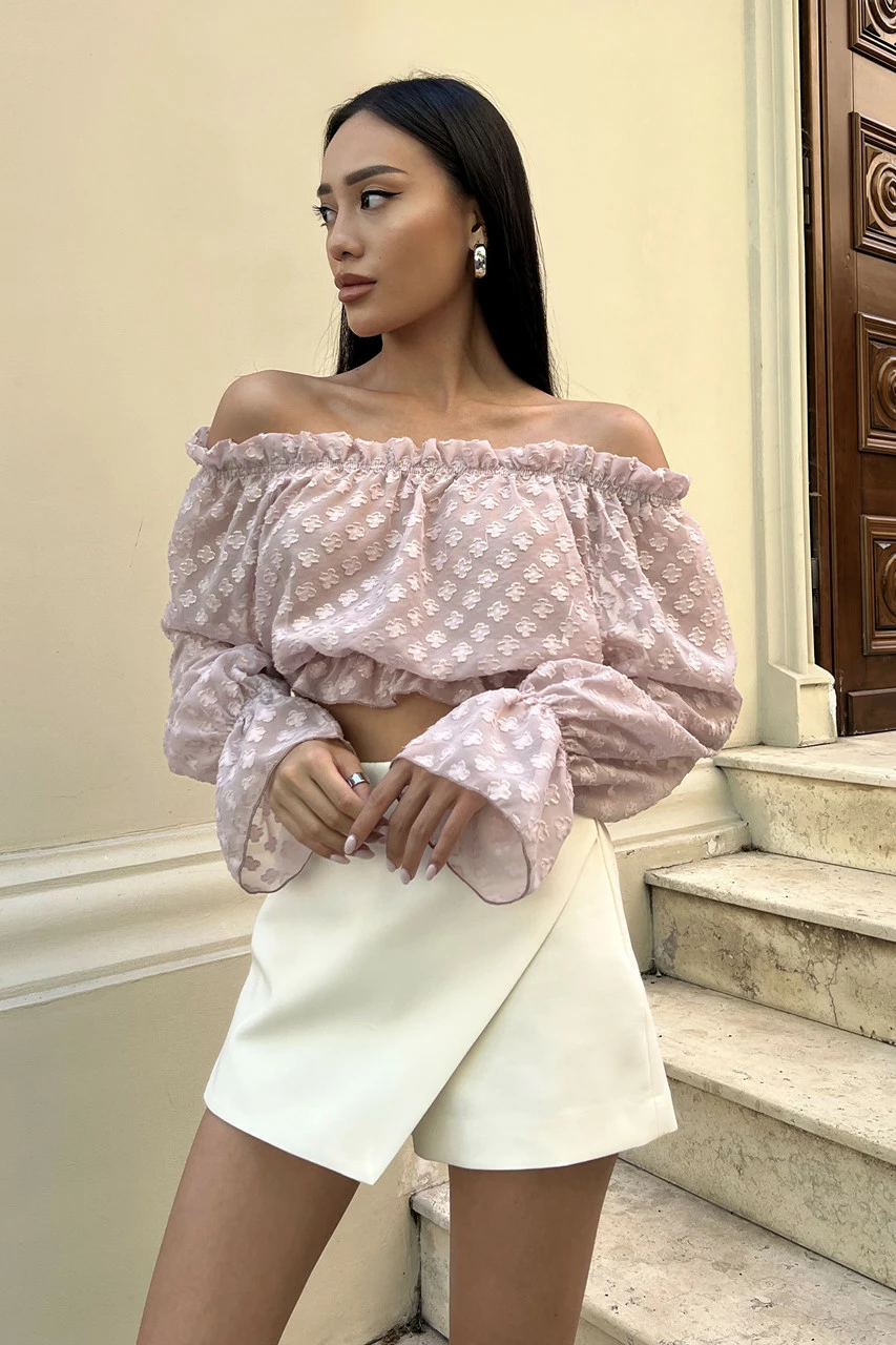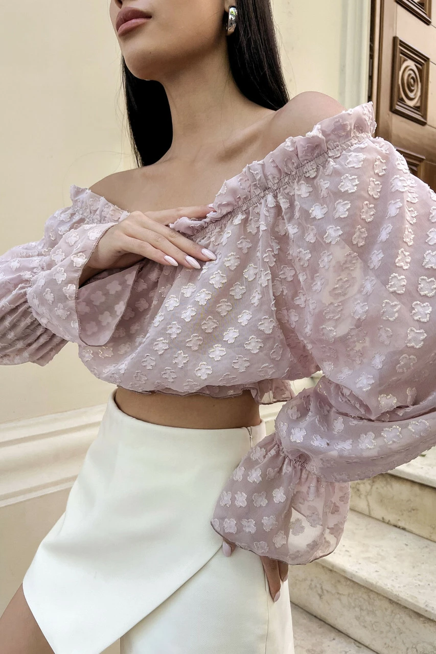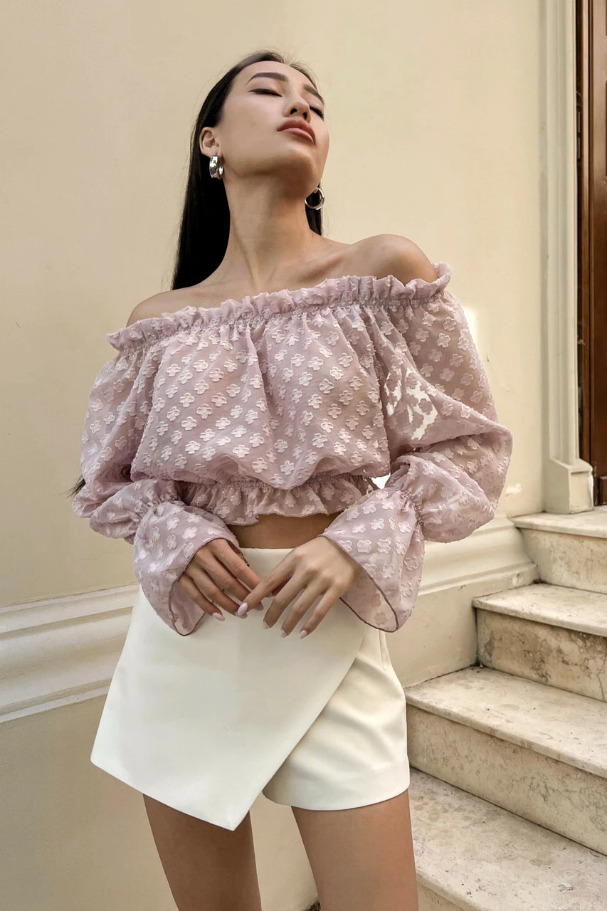 Трендова блуза укороченого крою, виготовлена із легкого напівпрозорого шифону у ніжних літніх кольорах. Модель відрізняється глибоким вирізом-човен з еластичними вставками, що дозволяє відкривати плечі. Ефектний довгий рукав з воланом та декор рюшами – одні з найактуальніших деталей SS22.