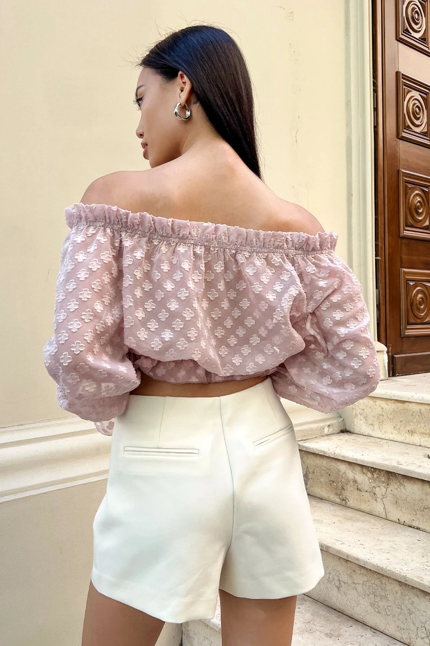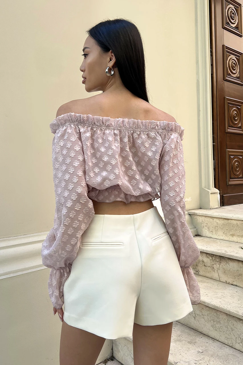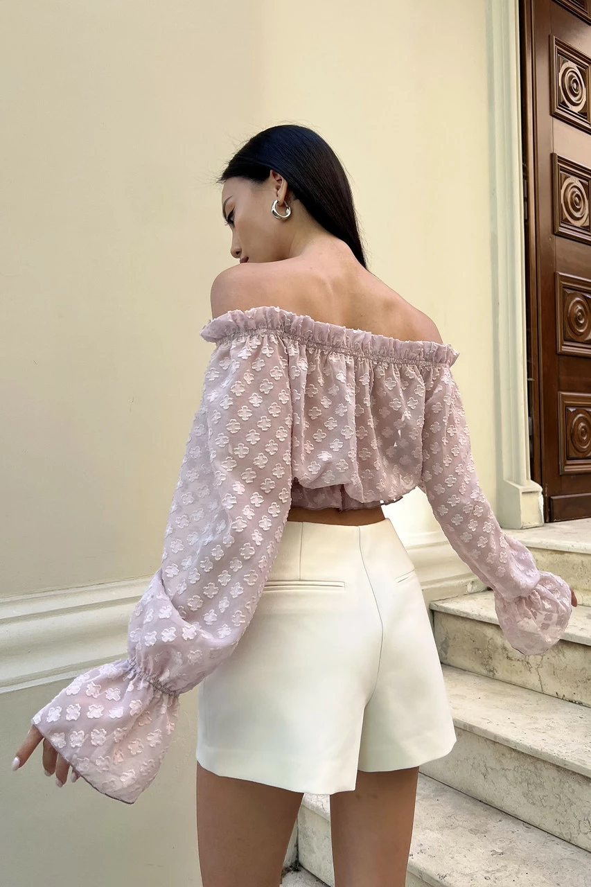Трендова блуза укороченого крою, виготовлена із легкого напівпрозорого шифону у ніжних літніх кольорах. Модель відрізняється глибоким вирізом-човен з еластичними вставками, що дозволяє відкривати плечі. Ефектний довгий рукав з воланом та декор рюшами – одні з найактуальніших деталей SS22.