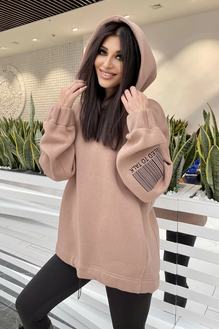 Объёмное худи owersize из теплого футера пенье - никогда не выходит из моды. Универсальная, комфортная вещь на все случаи жизни. Удобная длинна позволит носить худи с джинсами или лосинами, с ботфортами или юбкой макси, - сочетаний может быть великое множество. Внизу ширина худи регулируется шнурком. Удивительно качественная и комфортная ткань позволит Вам носить эту модель не один сезон. Прекрасный выбор на прохладную осень или зиму - теплая кофта с капюшоном, который в любой момент можно надеть или снять. Худи не обтягивает фигуру девушки, но и не выглядят объемно. Худи отлично скроет небольшие недостатки девушки любой комплекции, и при этом отлично выделит её достоинства. Широкая цветовая гамма позволит подобрать образ на любой вкус! На рукаве стильная накатка.