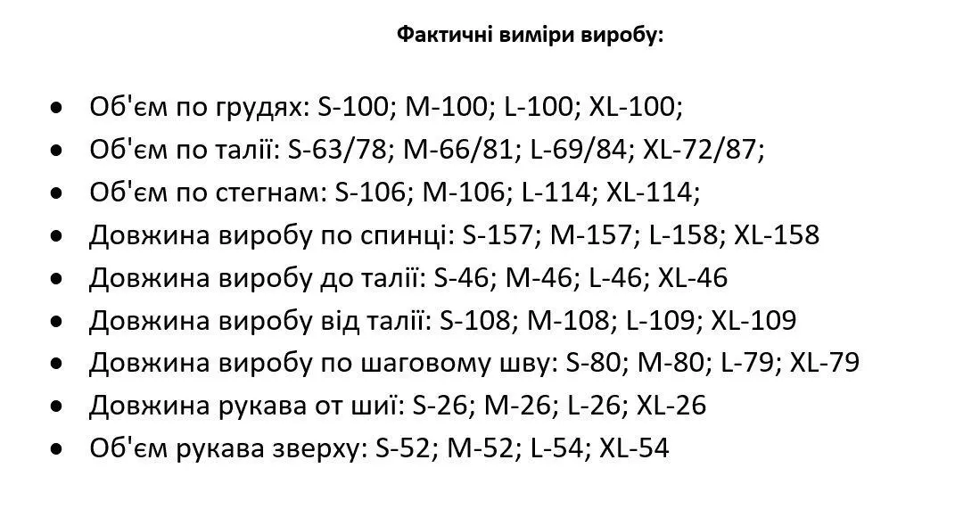 • Довжина виробу від талії: S-108; M-108; L-109; XL-109