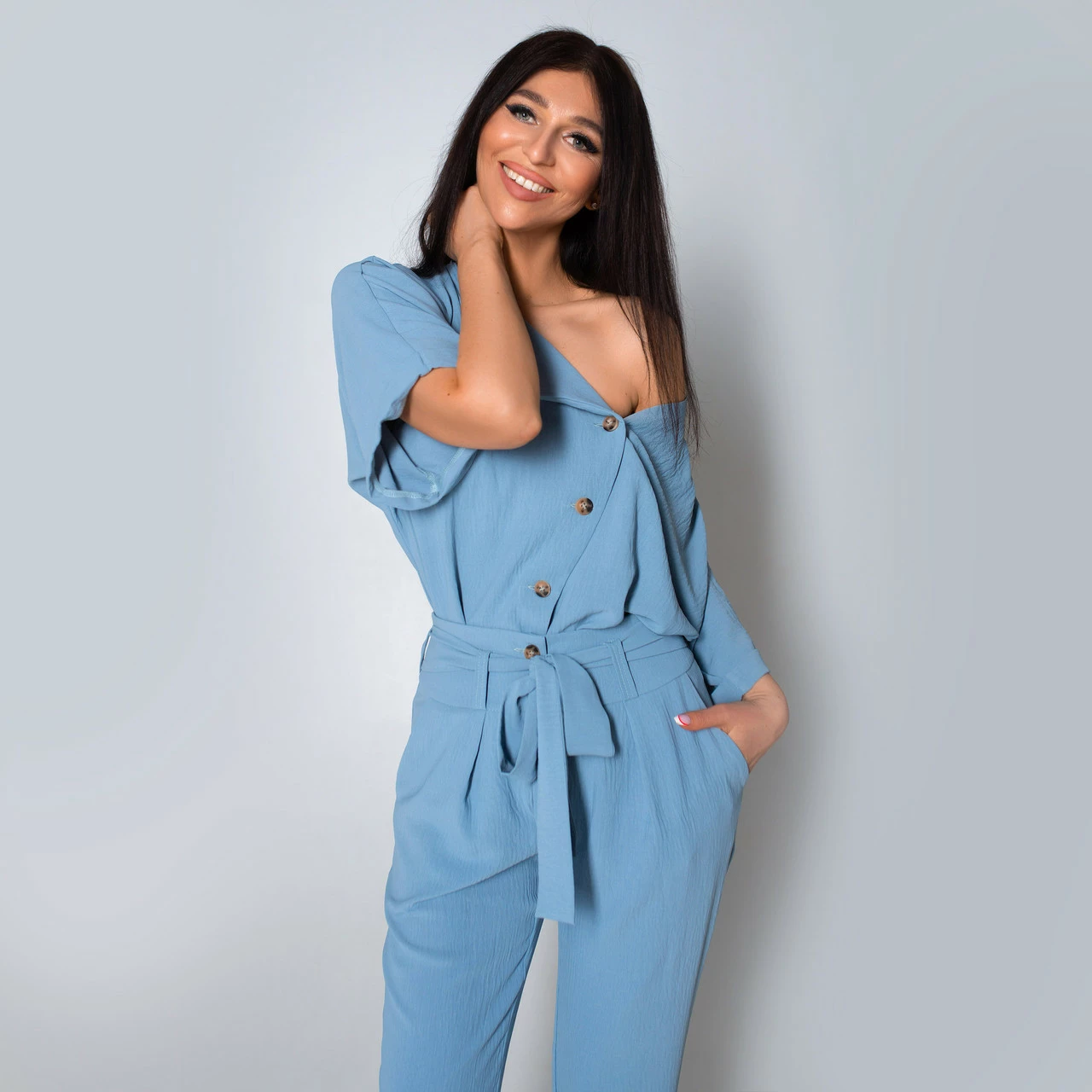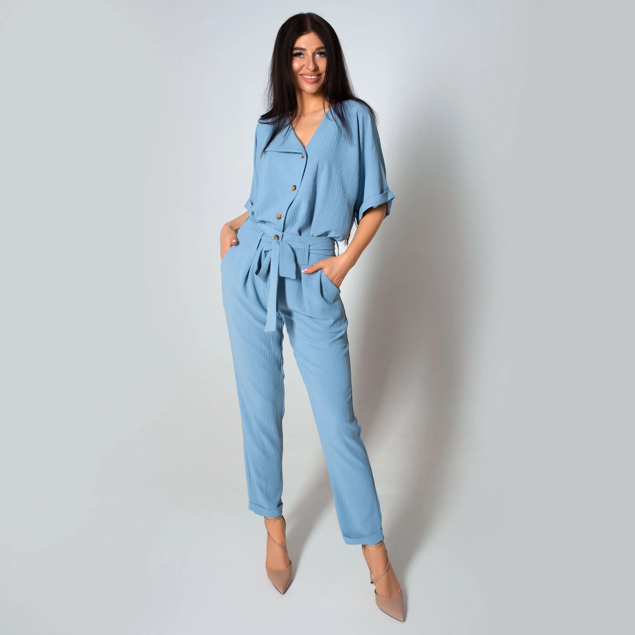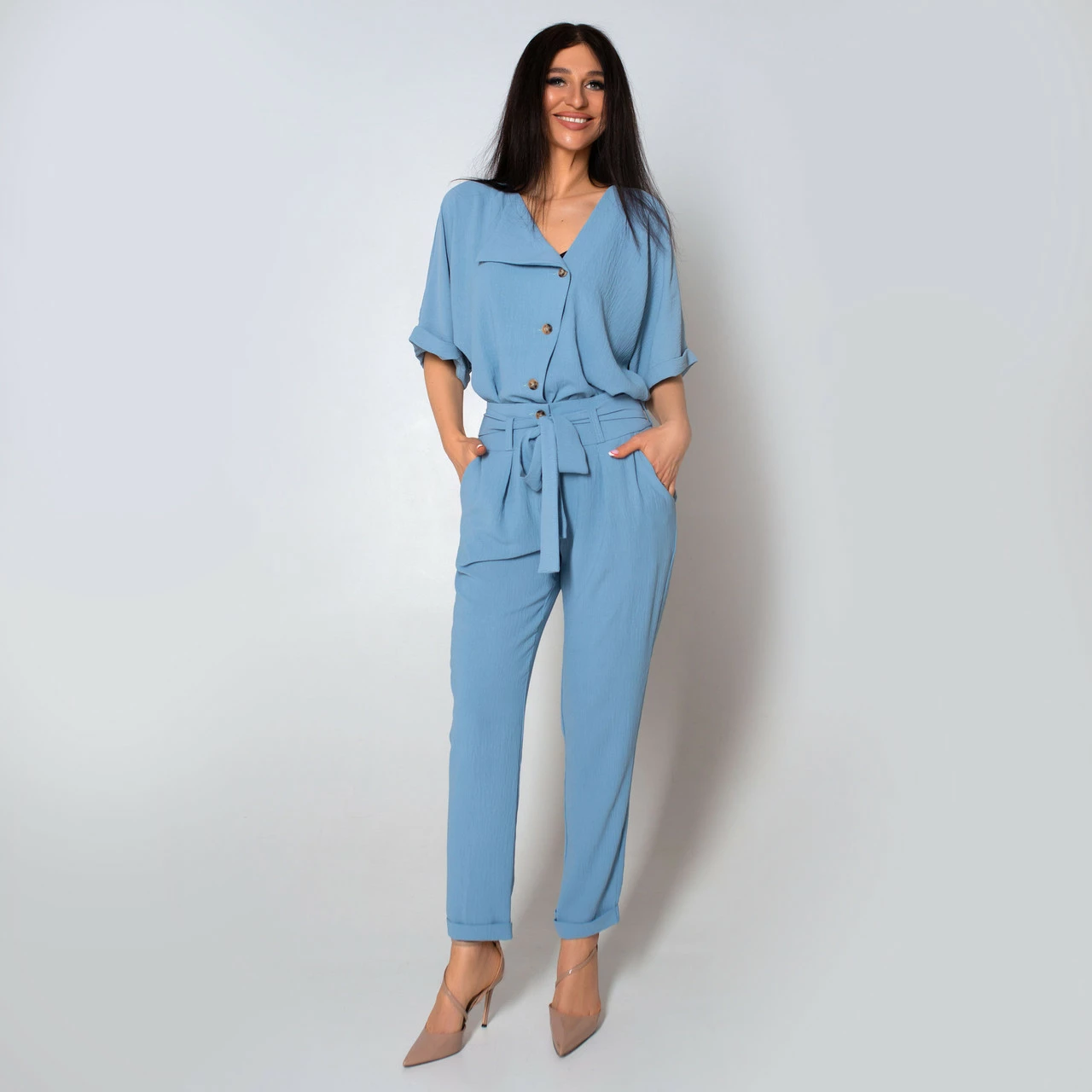 Попереду спекотне літо, а значить саме час оновити гардероб! Літо - це та сама пора, в якій так важко поєднати легкий яскравий образ і в той же час залишатися елегантною і ділової дівчиною. У цьому вам допоможе наш новий костюм Ервін, в якому ми вдало поєднали всі ці якості. Виконаний з легкого американського крепу, якістю і довговічністю якого Ви будете вражені. Представлений у вигляді подовженої блузи з коротким рукавом і планкою з гудзиками по переду. Брюки прямого крою додадуть елегантності і стилю. Пояс, який можна подати у вигляді кокетливого банта, відмінно скоректує лінію талії. У цьому костюмі Ви точно отримаєте море компліментів!