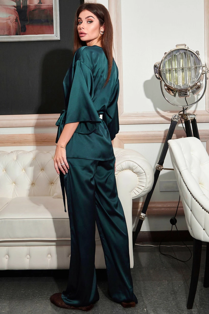 В новой коллекции «Home Style” наши модельеры создали универсальную модель пижамы, которая уже завоевала сердца представительниц прекрасного пола. Пижама «Лионе» выполнена из качественного шёлка «Армани» класса Люкс. Блуза и брюки прямого кроя придадут движению свободы и практичности в использовании. Пояс на блузе позволит скорректировать силуэт. Рукав в стиле «кимоно» придаст образу оригинальности.