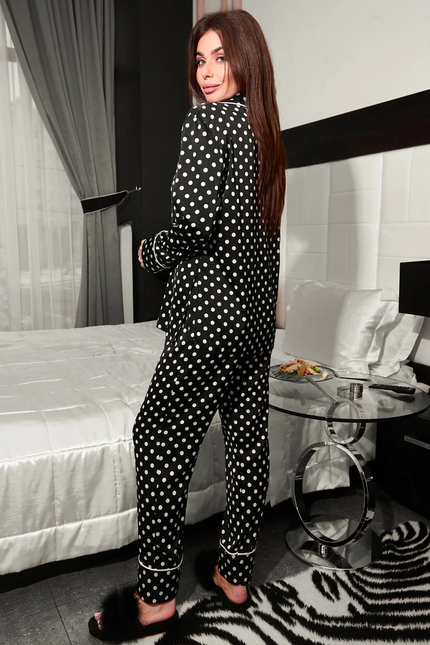 В нашей коллекции «Home style” кроме нежных пастельных оттенков, найдётся модель и для любительниц яркого и не ординарного образа. Пижама «Рау» изготовлена из шёлка «Армани» с интересным и бессменно популярным принтом — горохом. Прямой силуэт блузы и брюк придаст практичности и удобства в использовании. Создавай свой домашний образ вместе с Jadone Fashion!