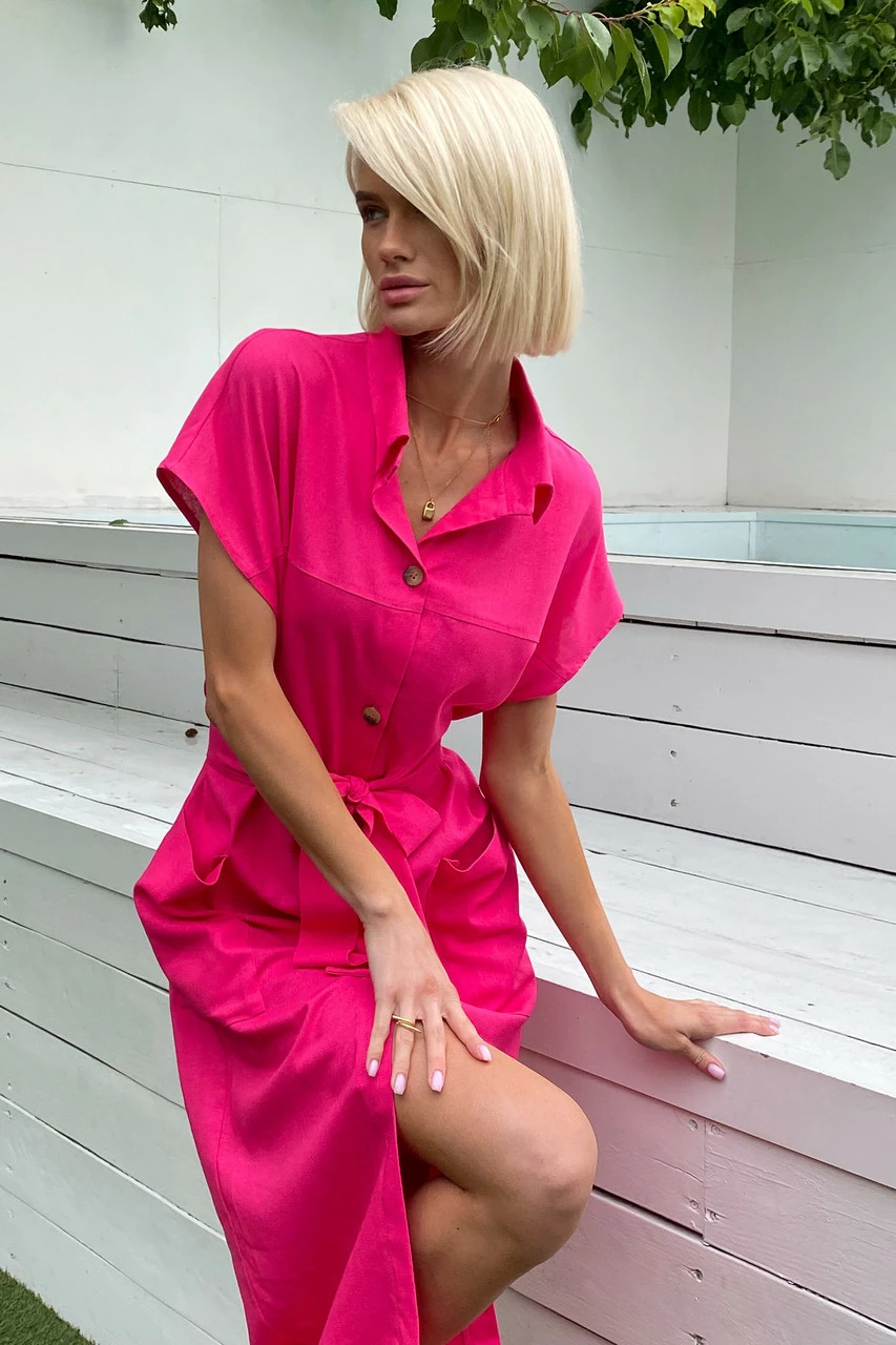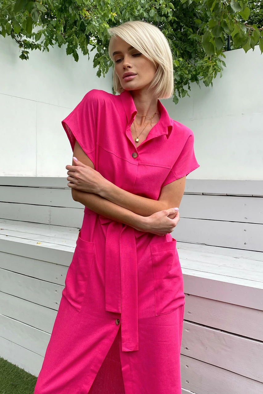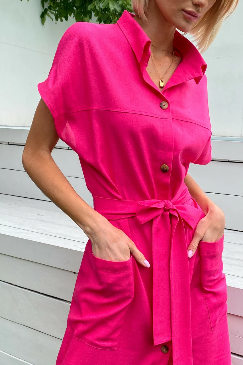Подовжене плаття-сорочка з льняної тканини: класичний відкладний комір, короткий спущений рукав з фіксованими вилогами, з’ємний пояс і дві накладні кишені. Надзвичайно легка та універсальна модель на кожен день!