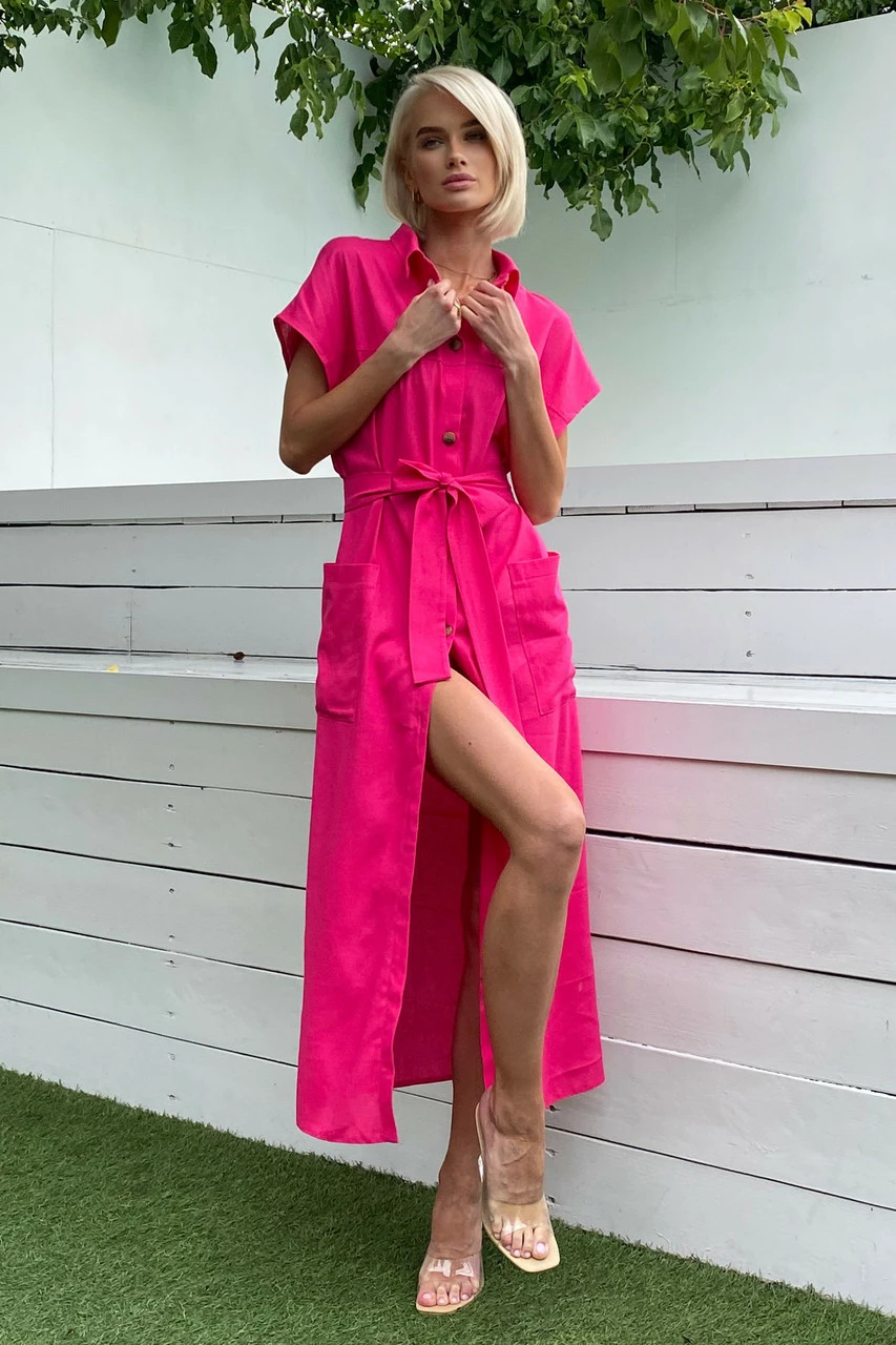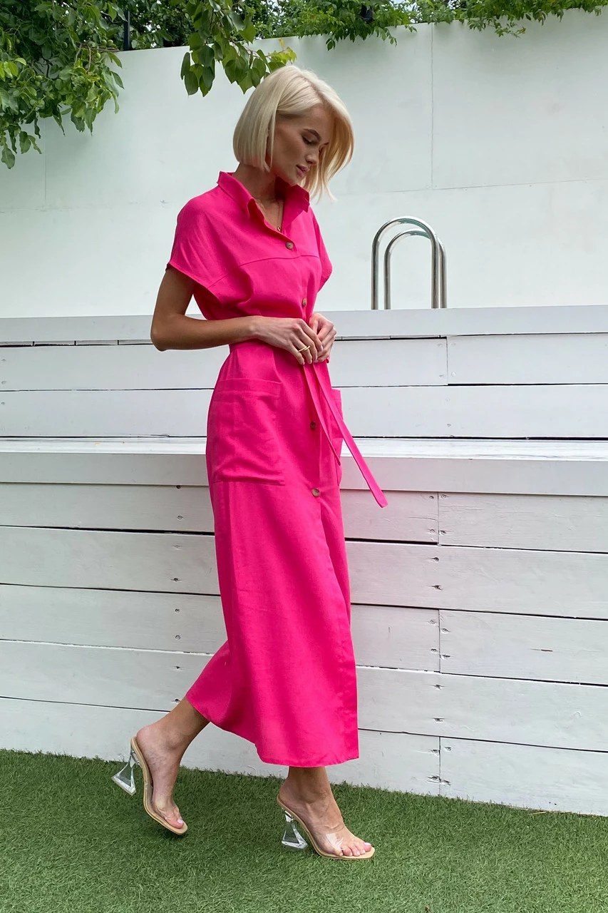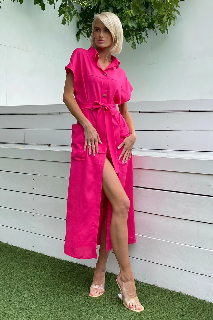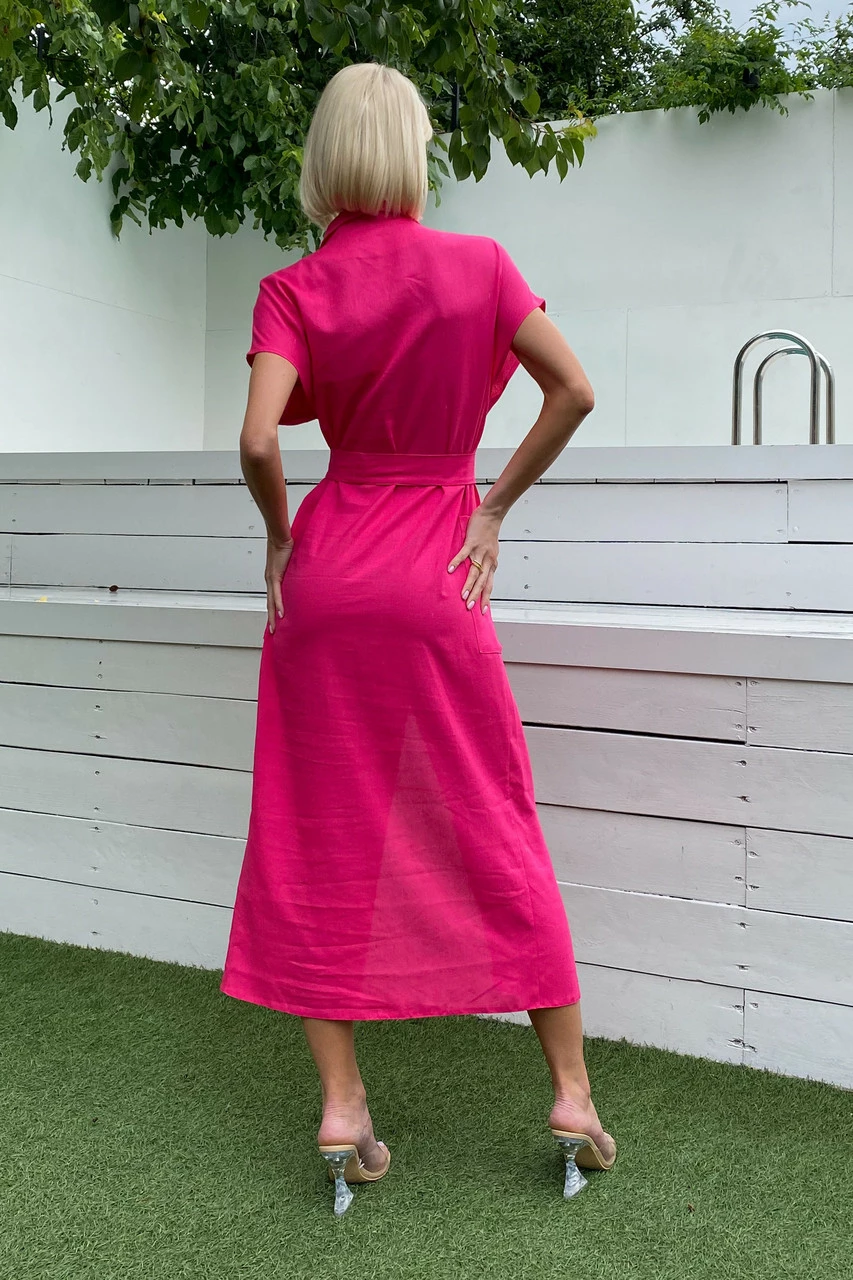 Подовжене плаття-сорочка з льняної тканини: класичний відкладний комір, короткий спущений рукав з фіксованими вилогами, з’ємний пояс і дві накладні кишені. Надзвичайно легка та універсальна модель на кожен день!