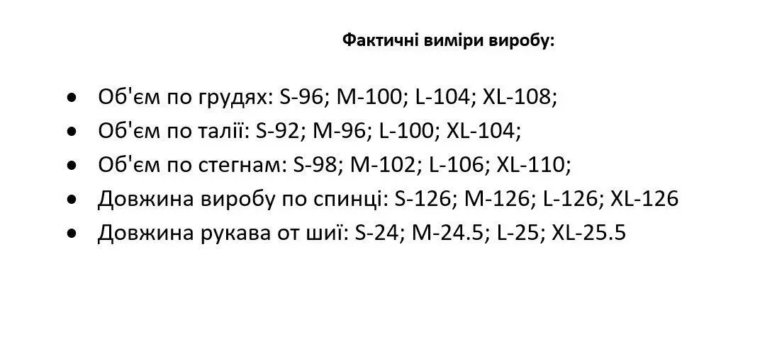 • Довжина виробу по спинці: S-126; M-126; L-126; XL-126