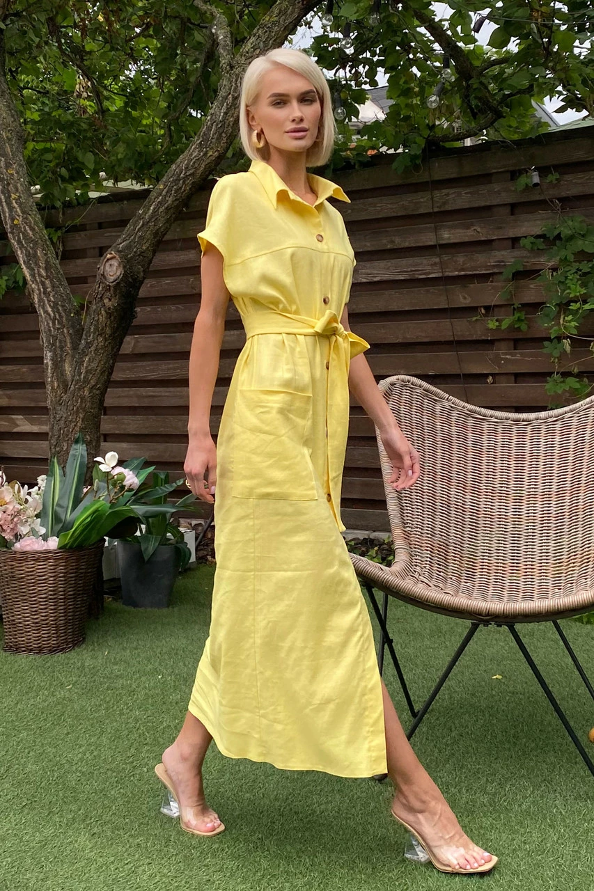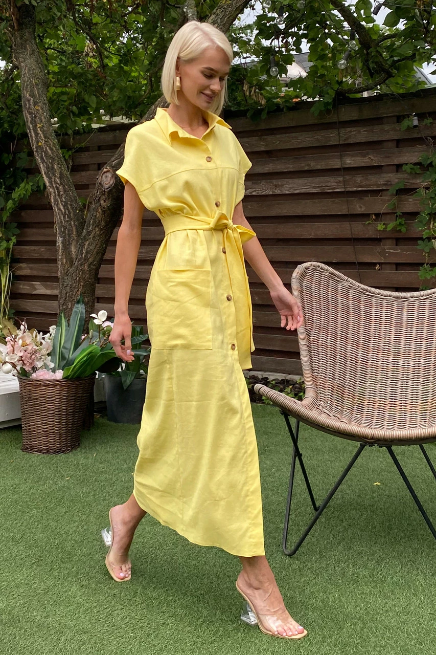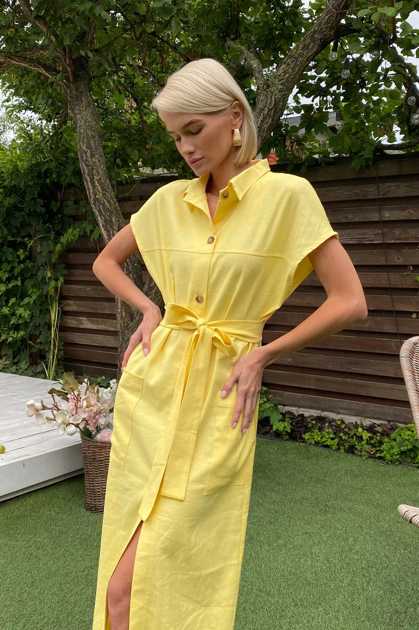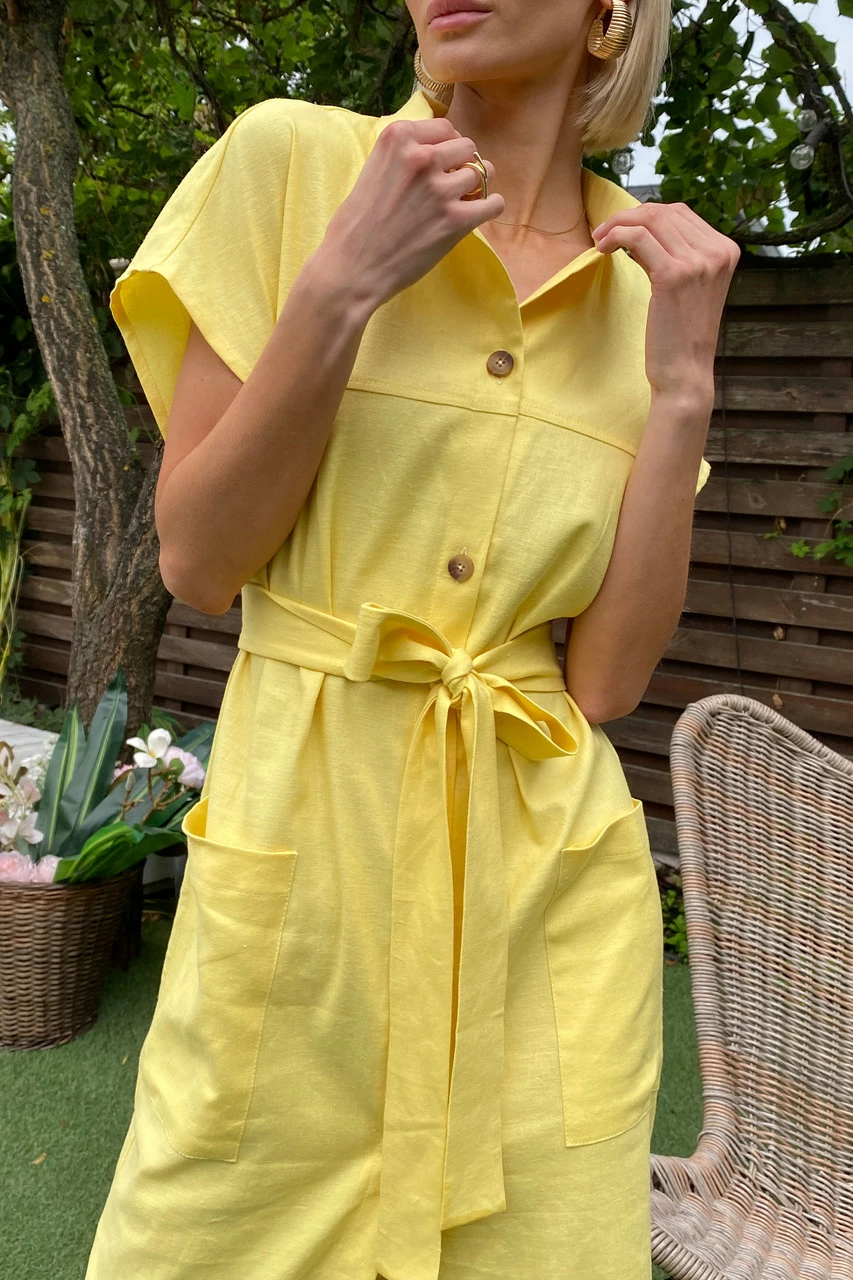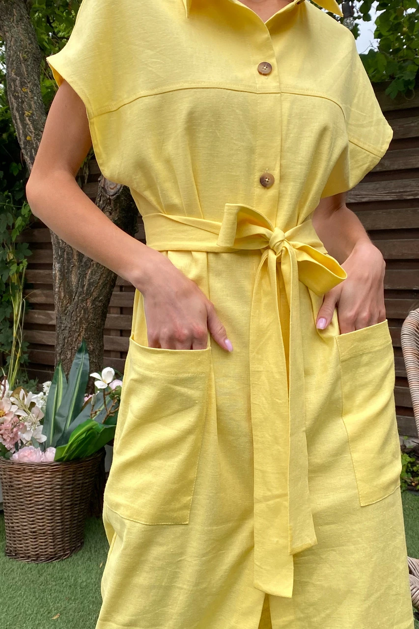 Подовжене плаття-сорочка з льняної тканини: класичний відкладний комір, короткий спущений рукав з фіксованими вилогами, з’ємний пояс і дві накладні кишені. Надзвичайно легка та універсальна модель на кожен день!