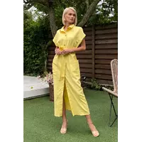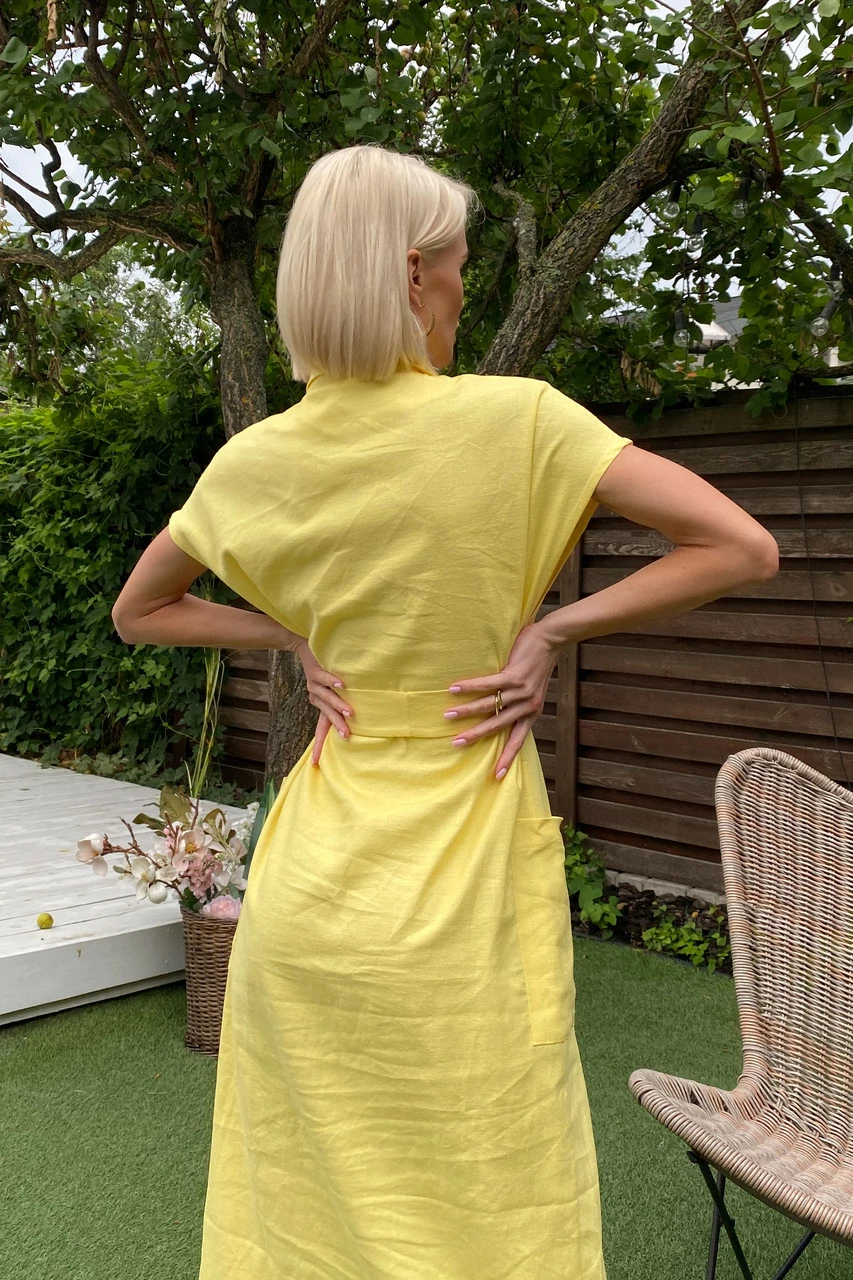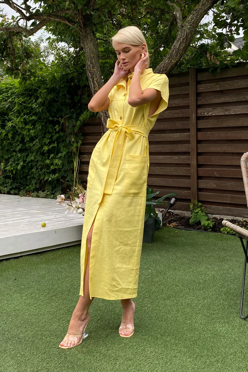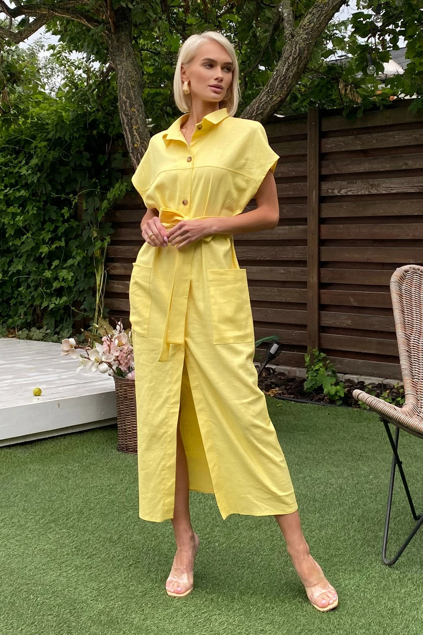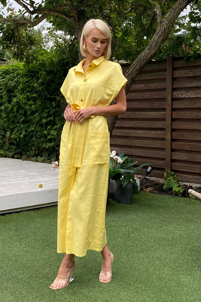 Подовжене плаття-сорочка з льняної тканини: класичний відкладний комір, короткий спущений рукав з фіксованими вилогами, з’ємний пояс і дві накладні кишені. Надзвичайно легка та універсальна модель на кожен день!