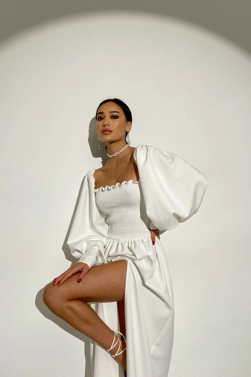 Шикарное и воздушное платье «Дилара» придаст нежности и женственности современный образ девушки. Платье Х-образного силуэта с пышным рукавом на высоком манжете. Лиф на резинке, отлично подойдет для стройных девушек да и обладательниц пышных форм. По переду предусмотрен высокий разрез. Рукав – пришивной на резинке. Пышная юбка придаст Вашему образу романтичности. К женственному образу смело добавляйте обувь на каблуке, компактные сумочки и элегантную бижутерию.