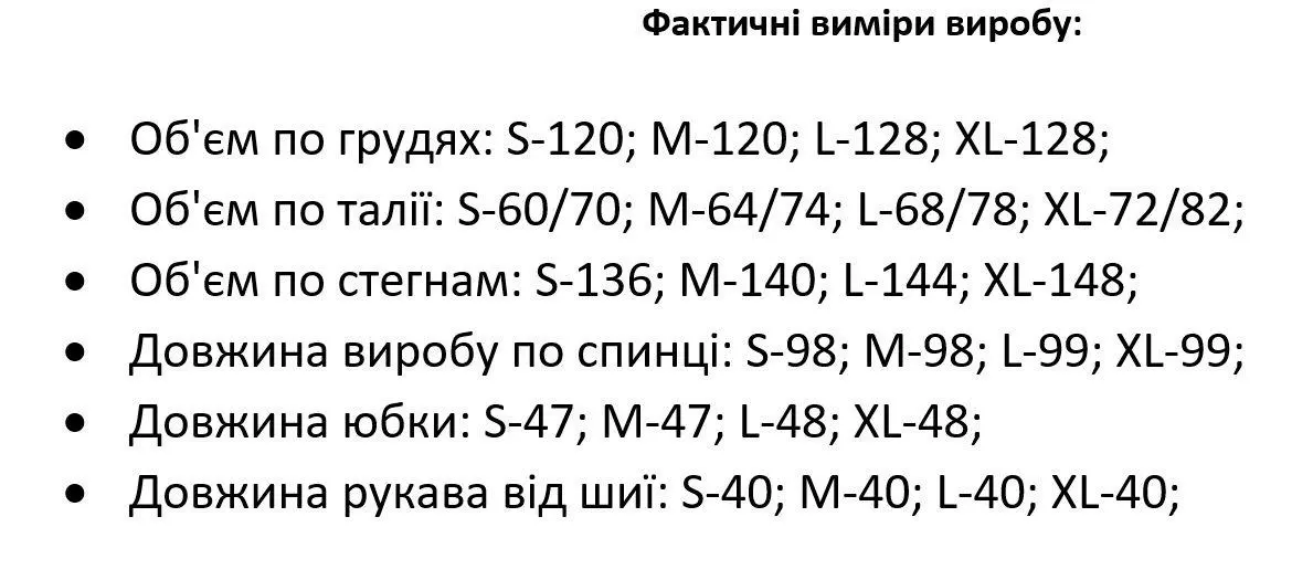 • Довжина юбки: S-47; M-47; L-48; XL-48;