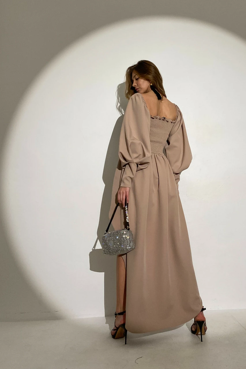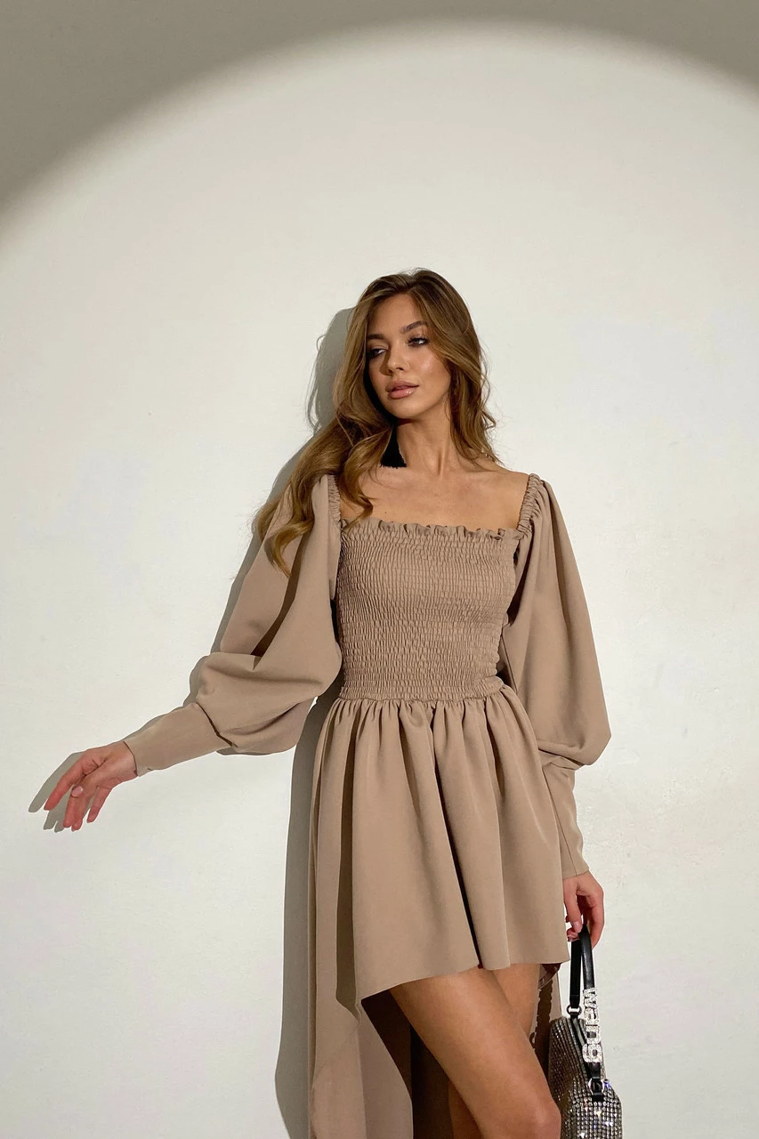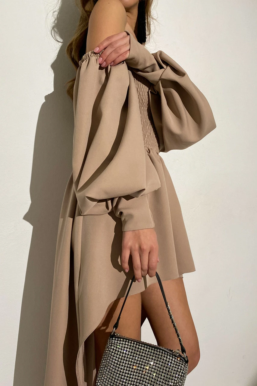 Женское и нежное платье «Малати» с пышной асимметричной юбкой станет отличным вариантом для празднования Нового Года 2022! Воздушное платье-резинка с пышными рукавами и высокими манжетами. Силуэт Х-образный. Короткая юбка по переду позволит продемонстрировать красивые ножки и придаст образу сексуальности! Платье представлено в классическом черном и бежевом, а также в нежно – голубом оттенке.