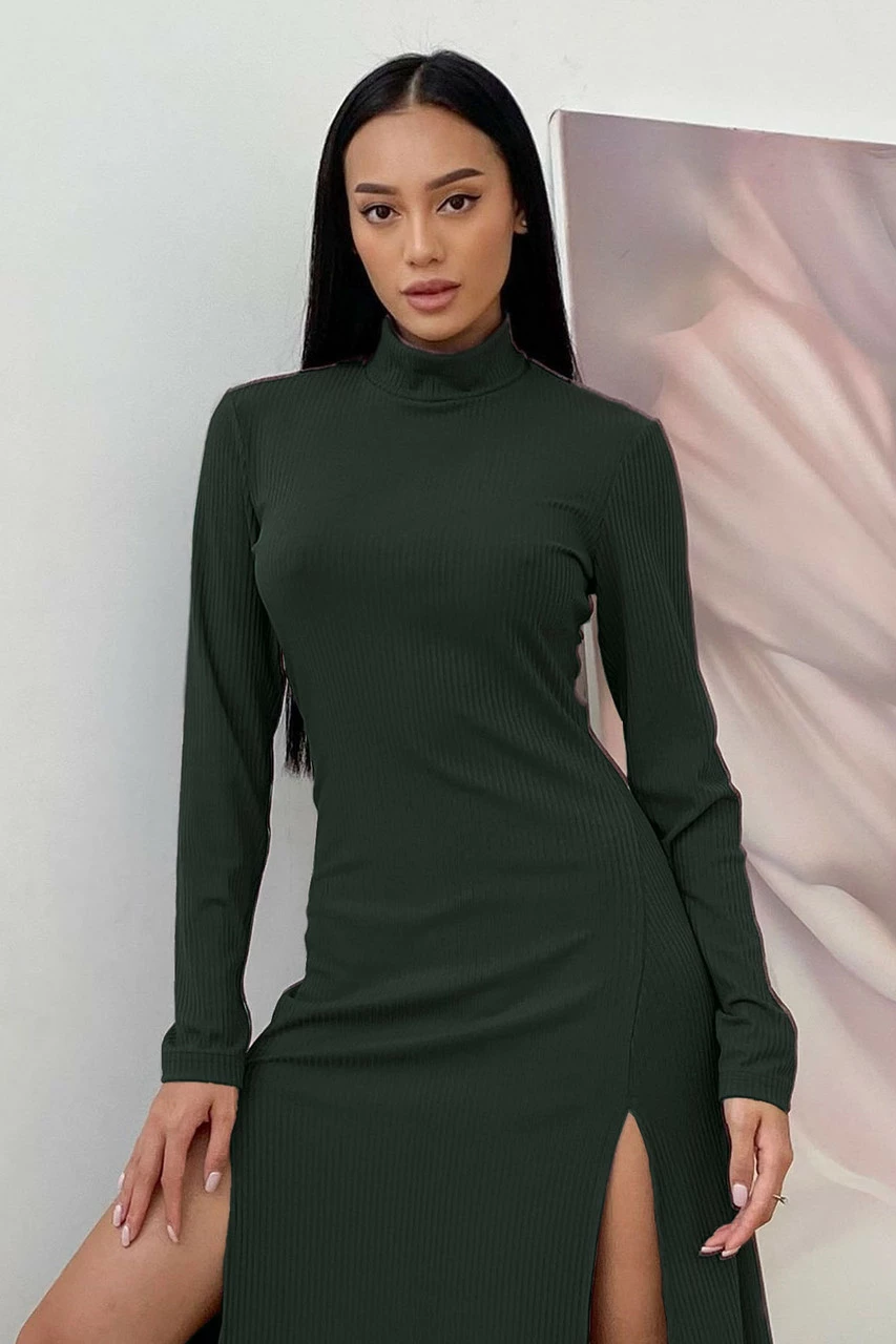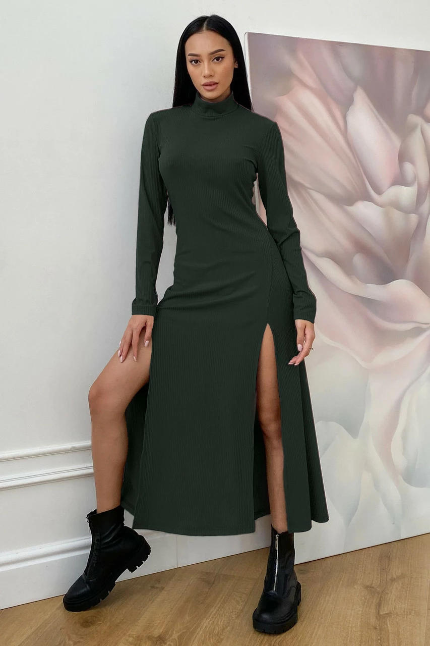Приталенное платье облегающего кроя с высокими разрезами по бокам. Универсальный вариант для любого типа фигуры, разрезы по бокам эффектно вытягивают фигуру.  Модель выходит в актуальных осенних цветовых решениях. Такое платье отлично подойти для каждодневного использования а также для романтического ужина.