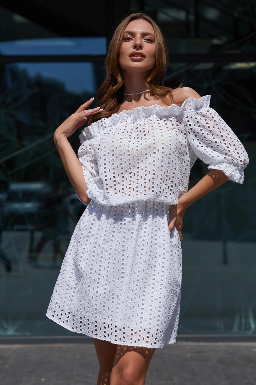 Милое платье из прошвы с подкладкой из натуральной ткани. Оптимальная длина и рукав реглан придают изделию женственности и романтичности. Спущенные плечики и талия на резинке добавляют нежности и утонченности модели. Юбка на подкладке.