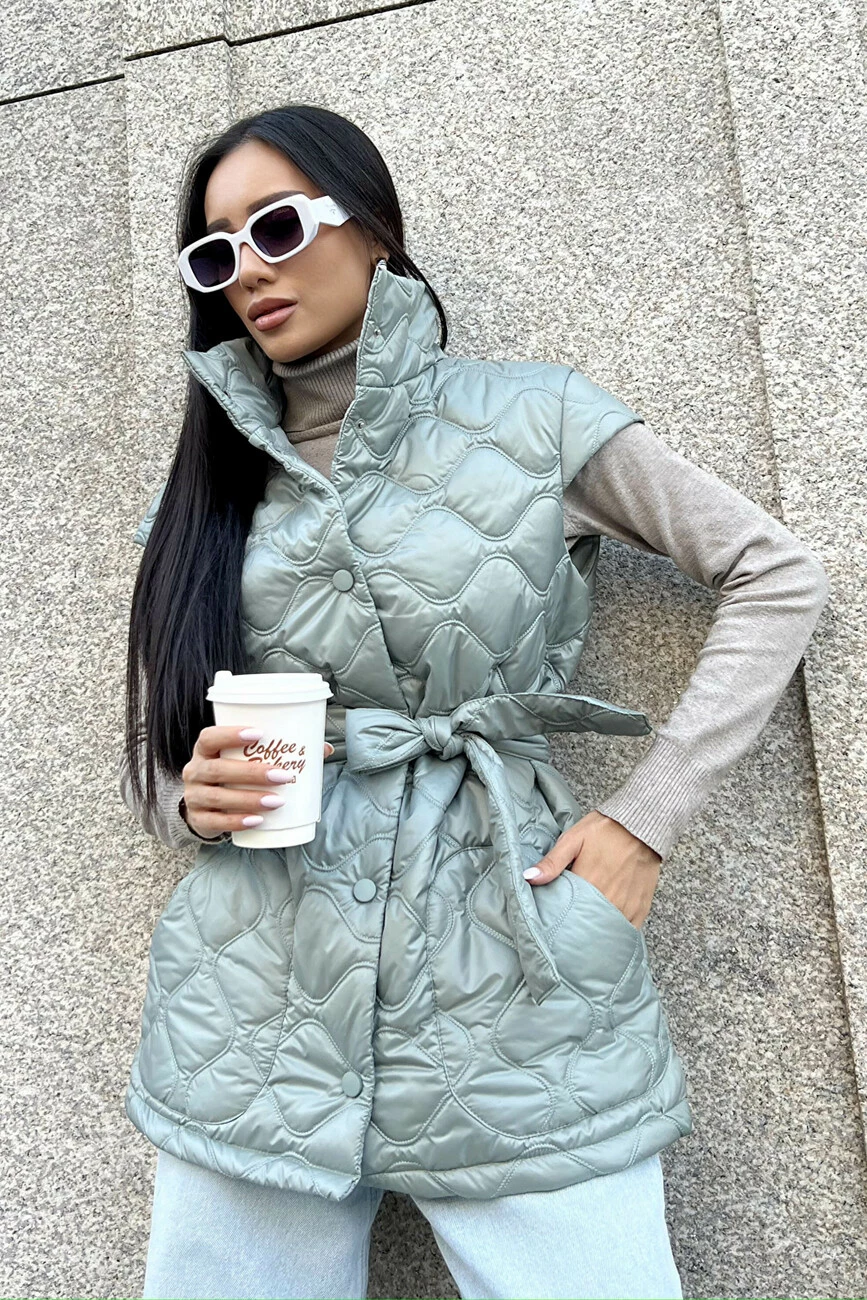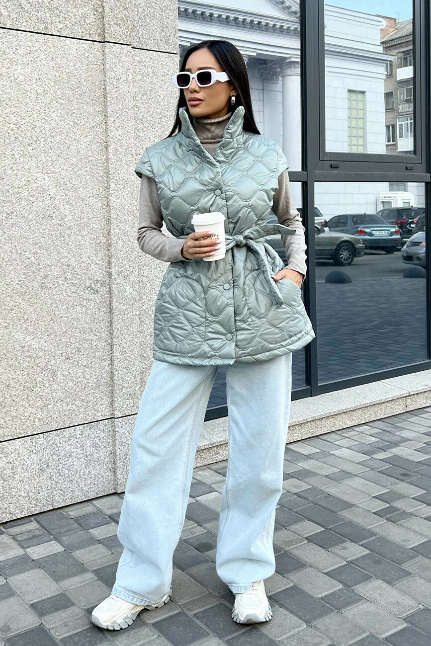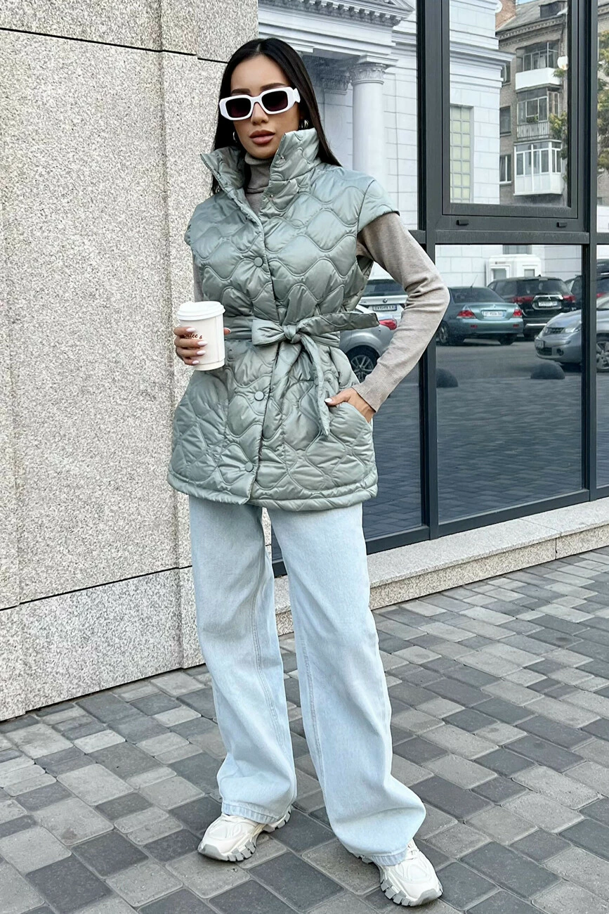 Теплий і затишний жилет, що застібається на кнопки, відрізняється зручністю і практичністю. Модель доповнена функціональними накладними кишенями. У комплекті пояс – в тон.