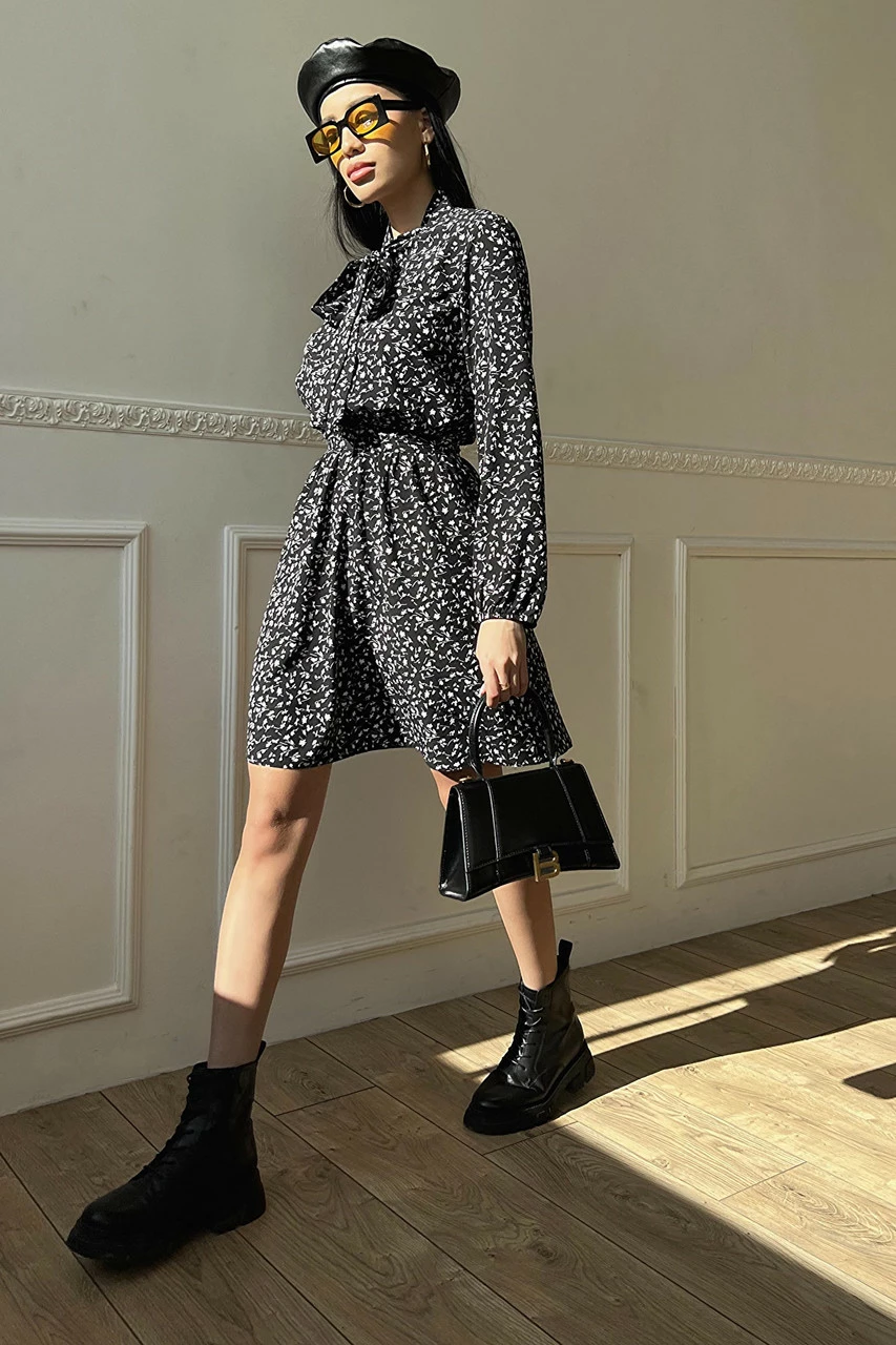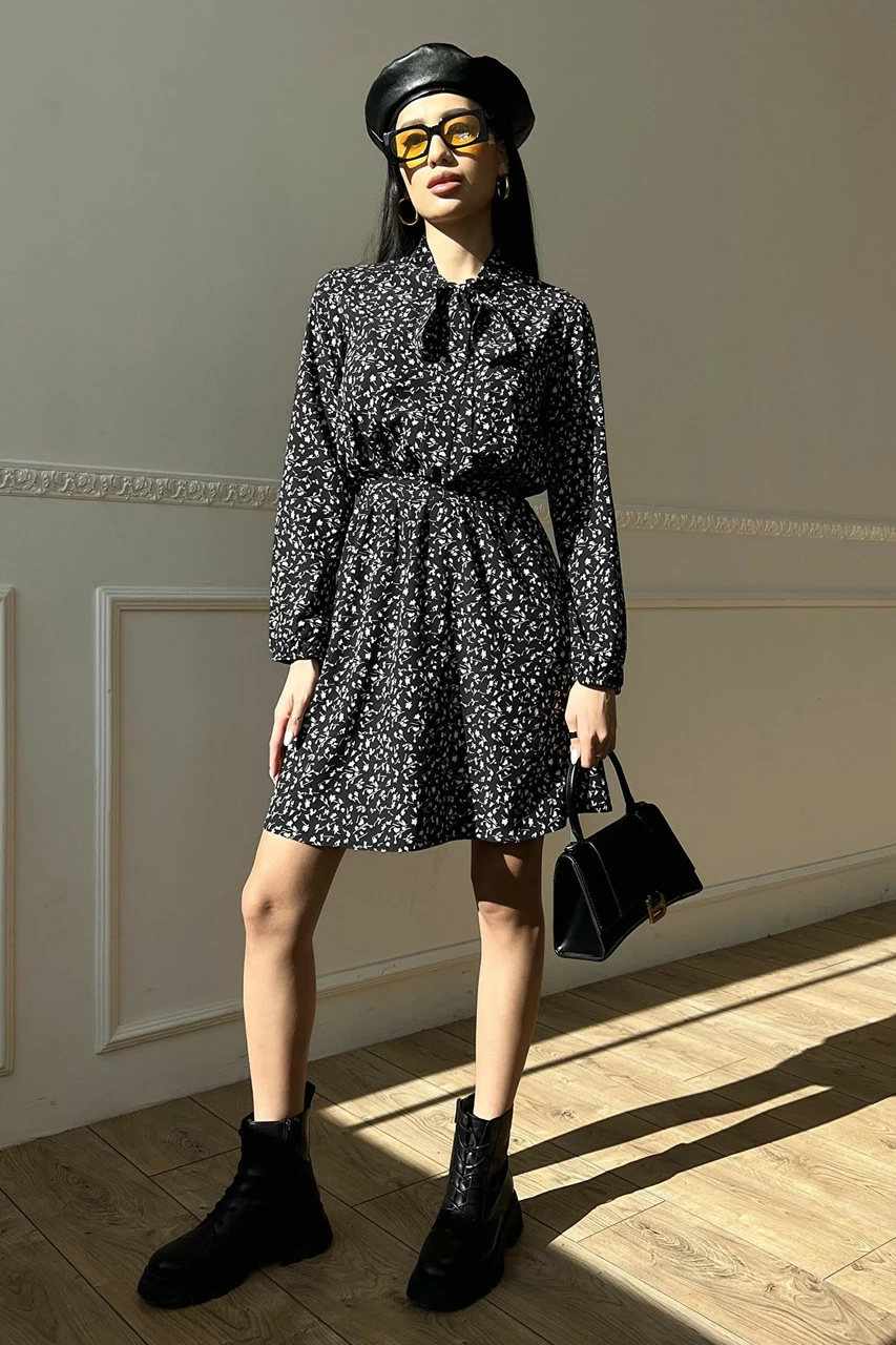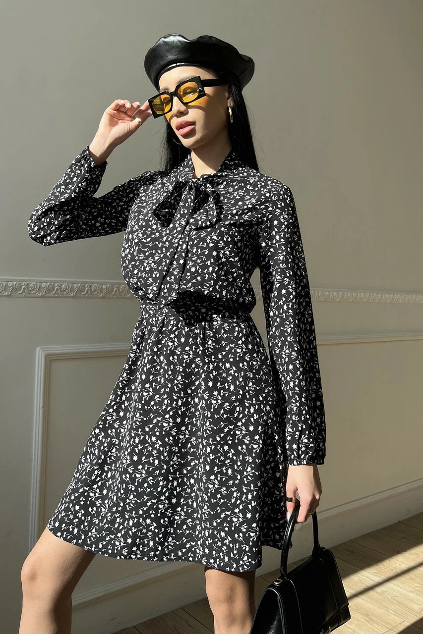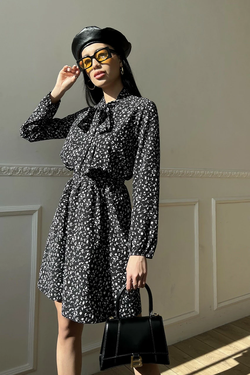 Вільний довгий рукав з еластичною манжетою, пояс у колір сукні, комір-аскоту із зав'язками, коротка спідниця - допоможуть створити неповторний образ на кожен день.