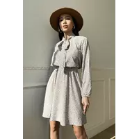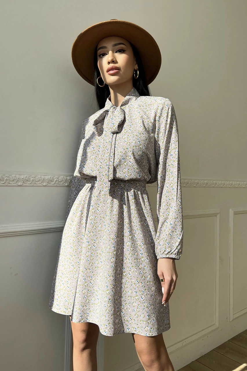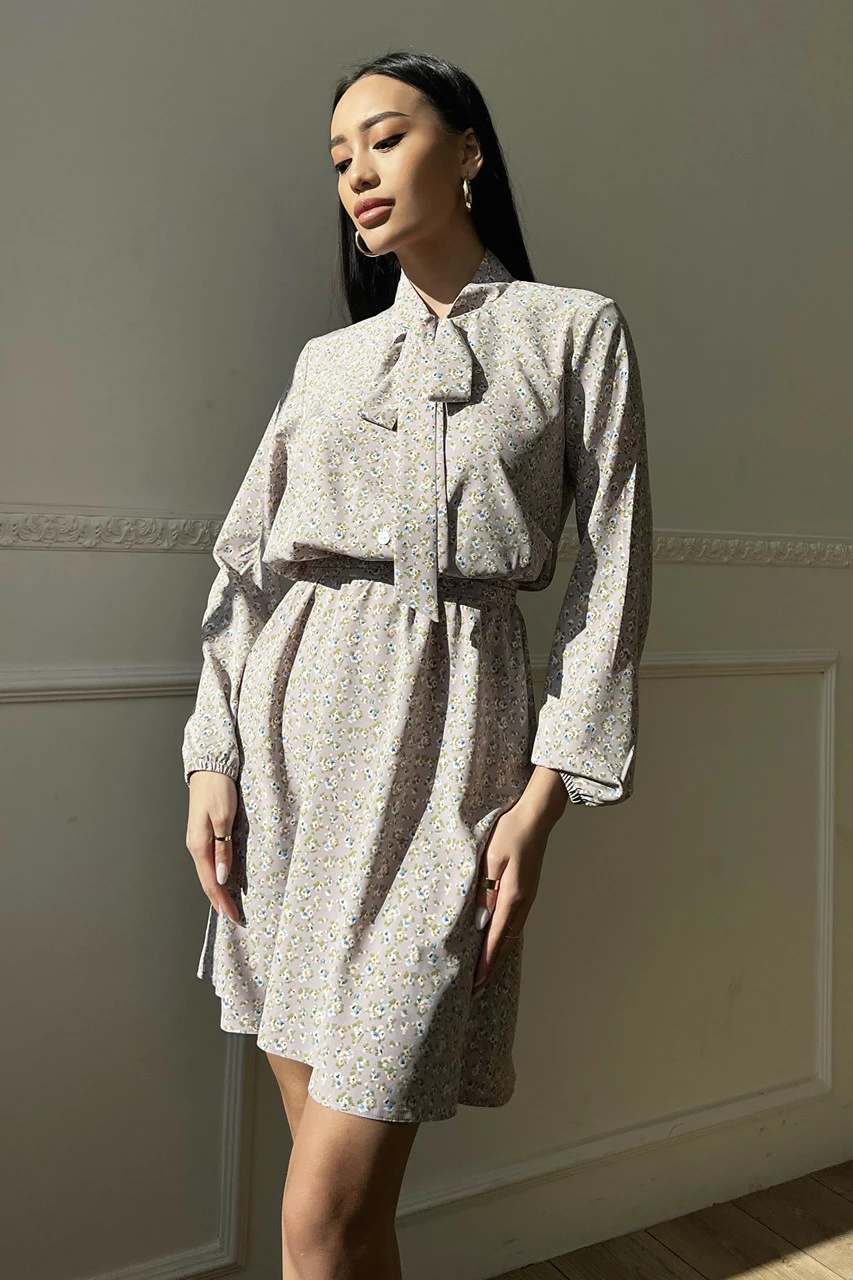 Вільний довгий рукав з еластичною манжетою, пояс у колір сукні, комір-аскоту із зав'язками, коротка спідниця - допоможуть створити неповторний образ на кожен день.