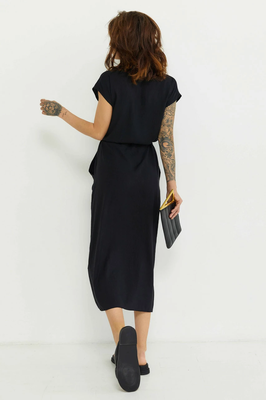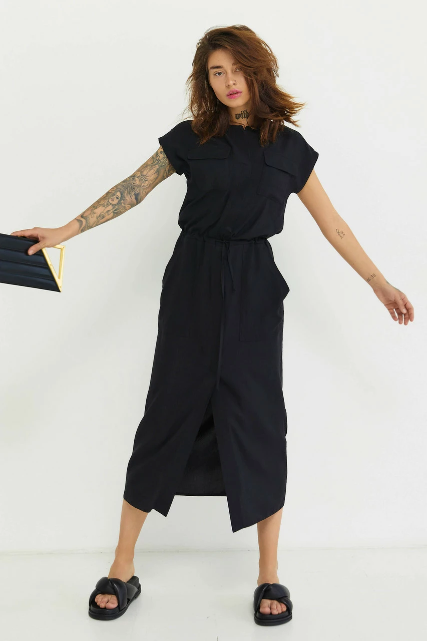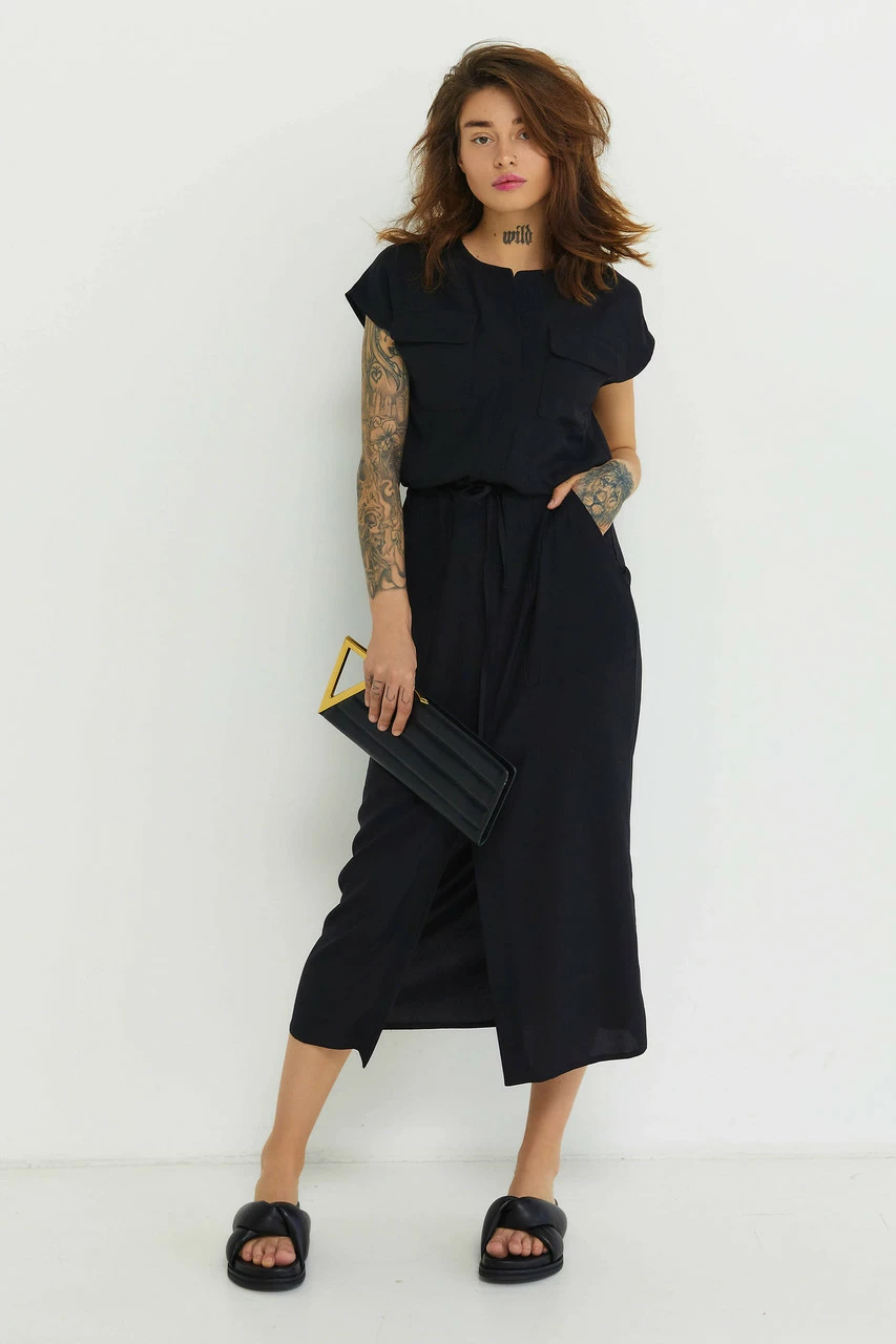 Сукня з якісного американського крепу прямого силуету з розрізом по переду, коміром стійкою та накладними кишенями на грудях. Простота та зручність це головний критерій, який ми використали при створенні цієї моделі.