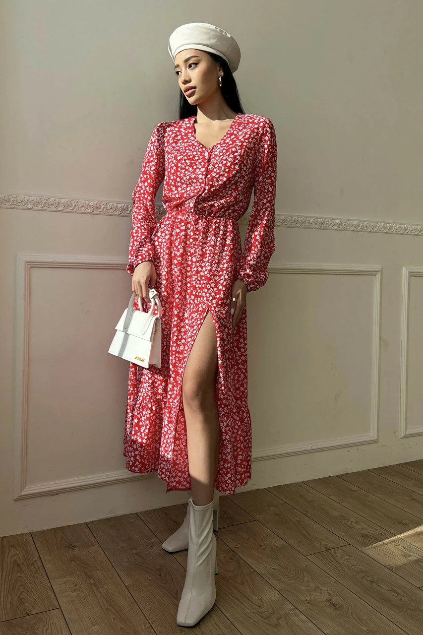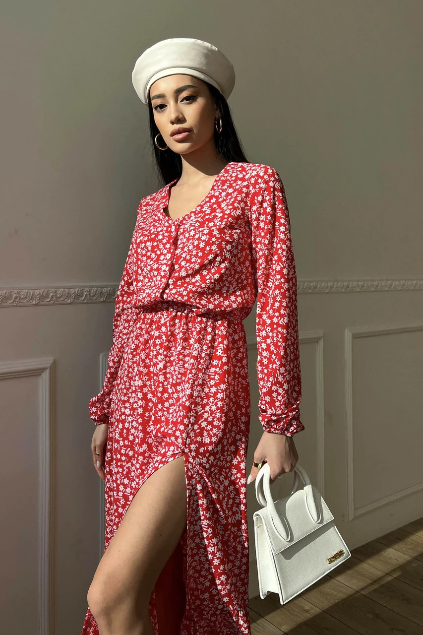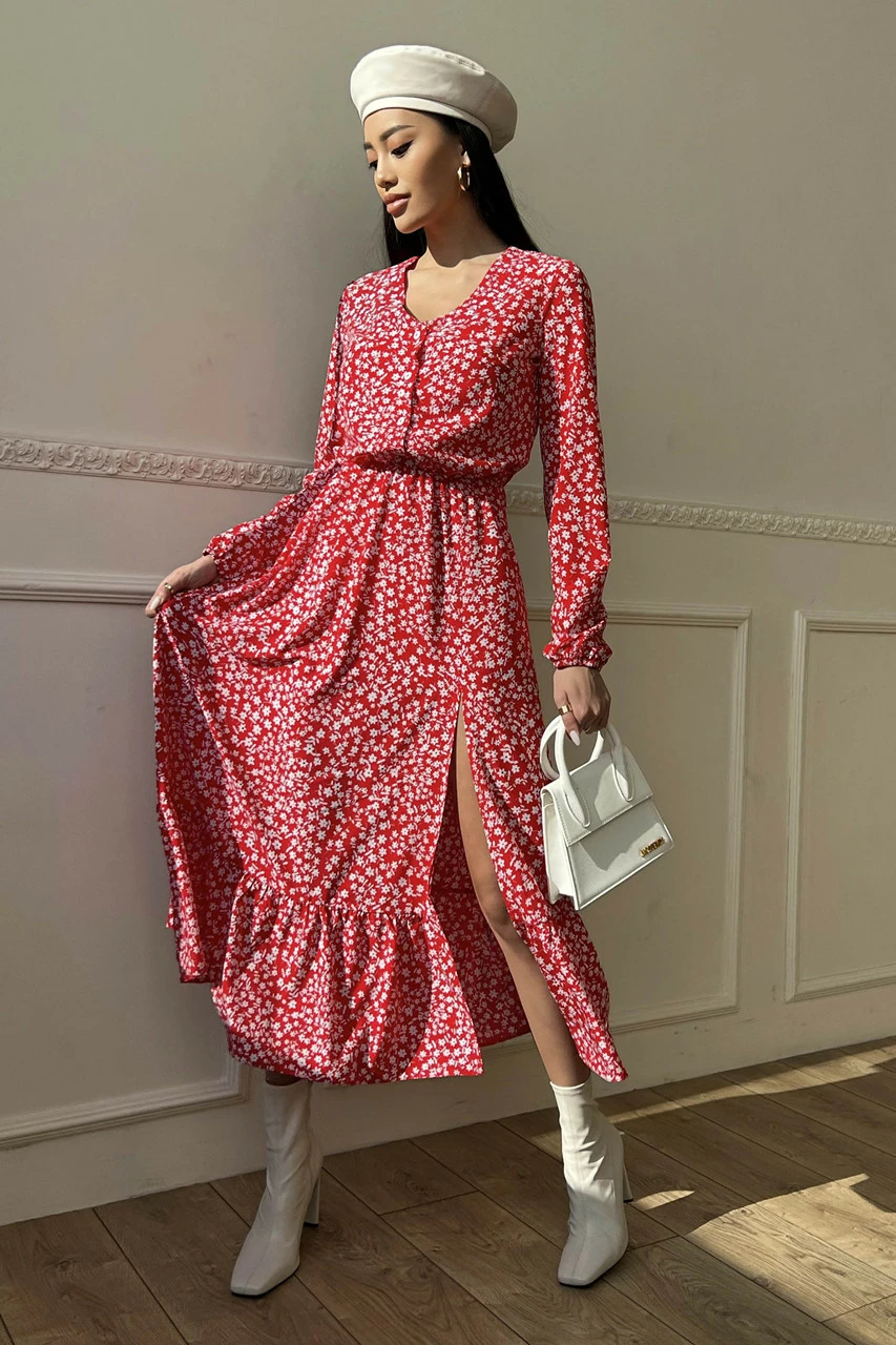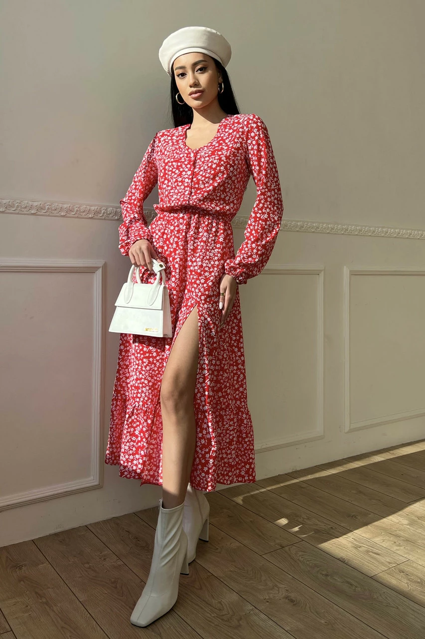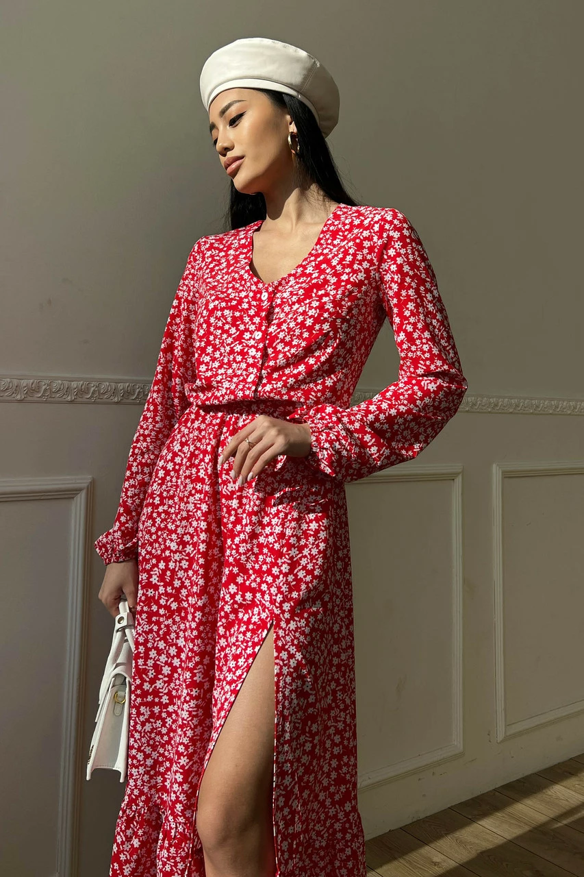 Шикарна сукня – міді, з легкої тканини, - прекрасний вибір на кожен день! Ніжний та одночасно вразливий образ прекрасної власниці нашої новинки підкреслить  розріз по переду. Сукня вільного крою, з резинкою по талії, по переду для зручності передбачені ґудзики, рукав на резинці. Ця модель сукні буде відмінно виглядати с косухою та кедами.