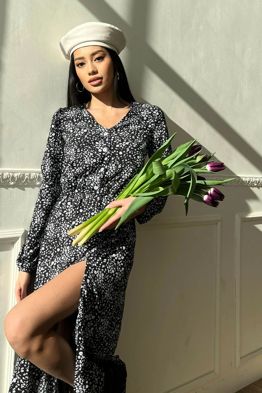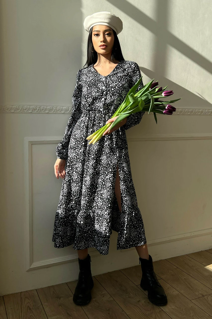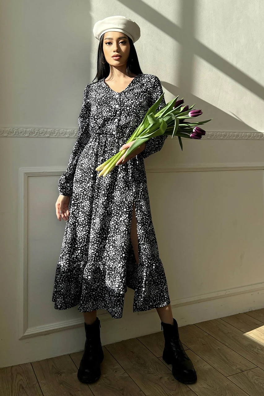 Шикарна сукня – міді, з легкої тканини, - прекрасний вибір на кожен день! Ніжний та одночасно вразливий образ прекрасної власниці нашої новинки підкреслить  розріз по переду. Сукня вільного крою, з резинкою по талії, по переду для зручності передбачені ґудзики, рукав на резинці. Ця модель сукні буде відмінно виглядати с косухою та кедами.