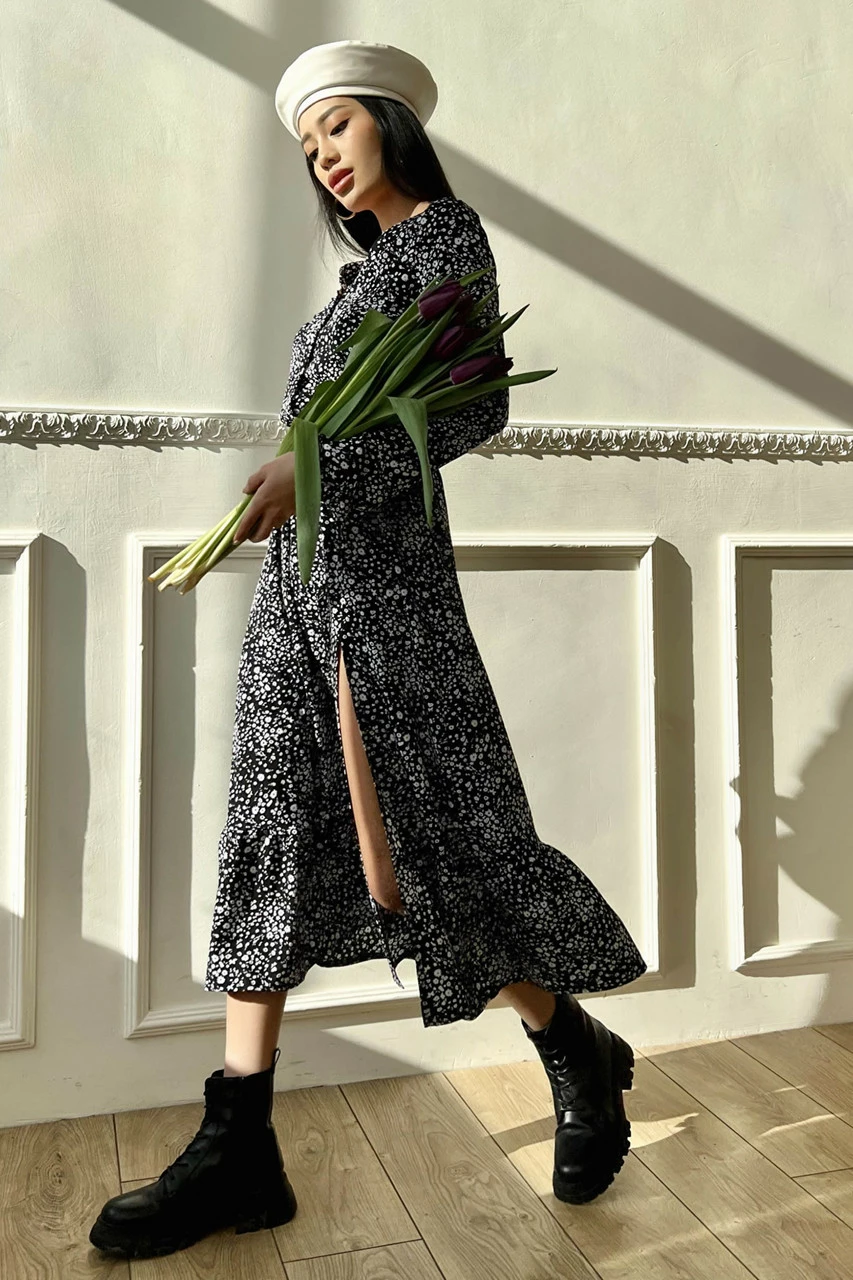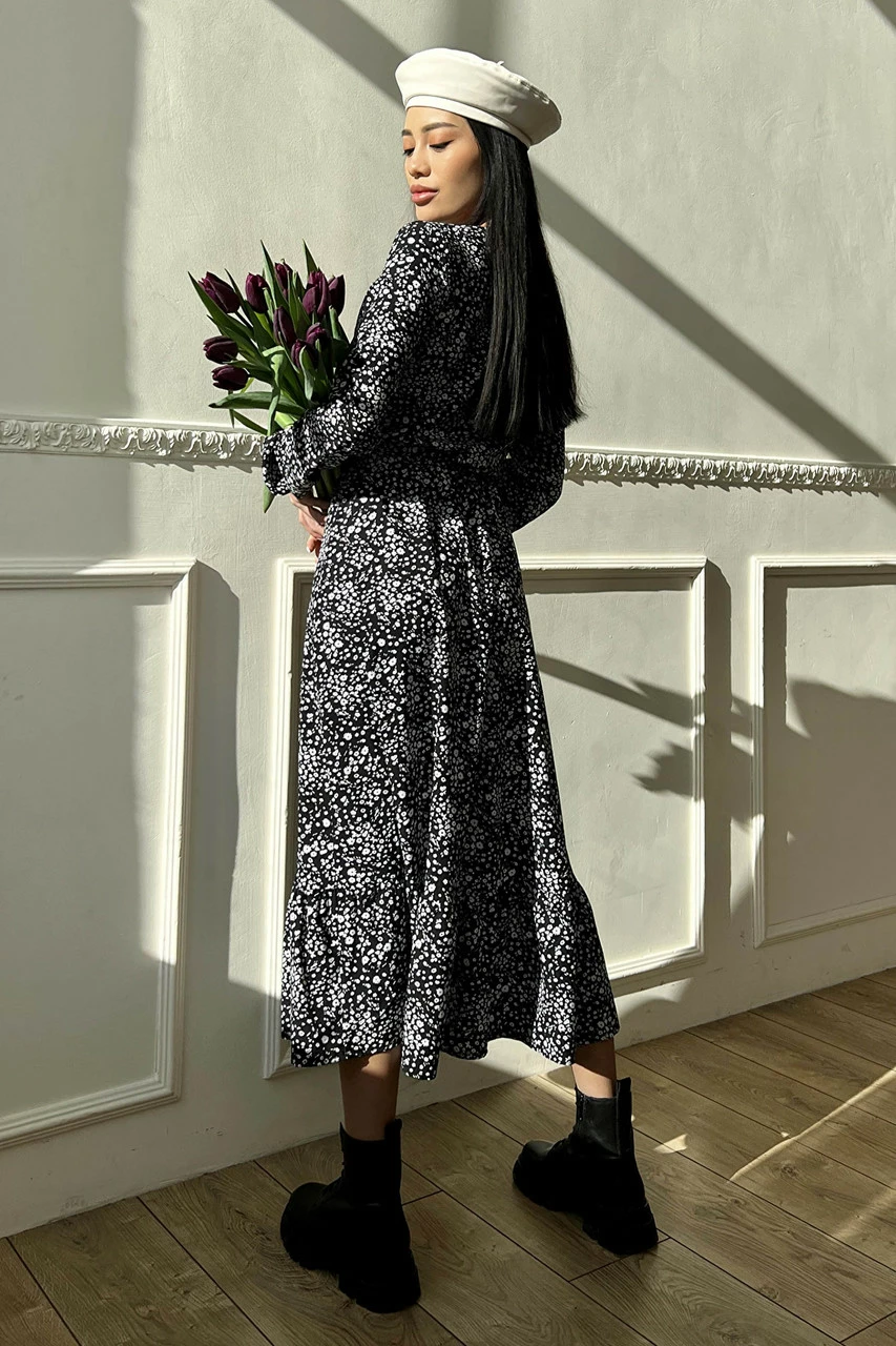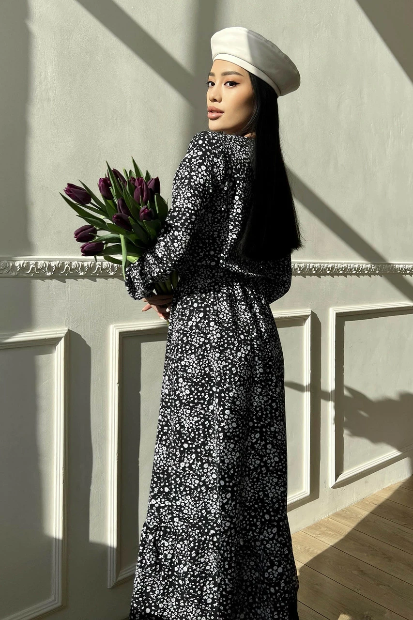 Шикарна сукня – міді, з легкої тканини, - прекрасний вибір на кожен день! Ніжний та одночасно вразливий образ прекрасної власниці нашої новинки підкреслить  розріз по переду. Сукня вільного крою, з резинкою по талії, по переду для зручності передбачені ґудзики, рукав на резинці. Ця модель сукні буде відмінно виглядати с косухою та кедами.