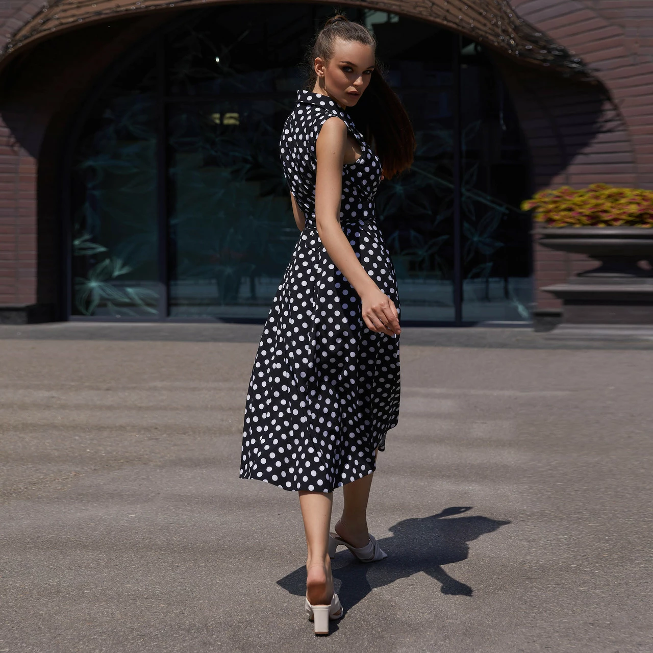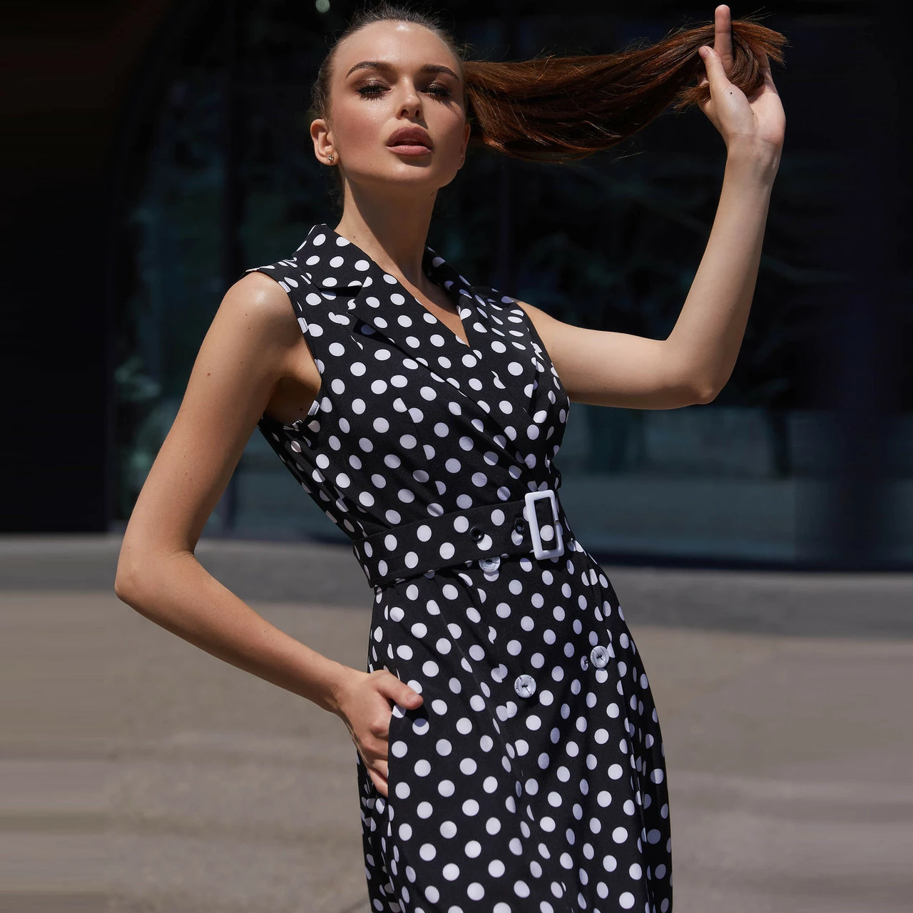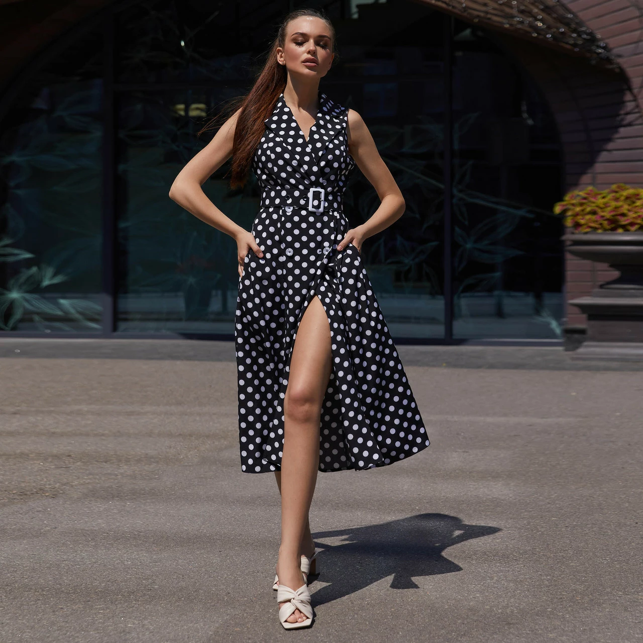 Цього сезону як ніколи популярні сукні з принтом у великий горох. Ми представляємо Вашій увазі плаття класичного формату з улюбленим усіма білим горошком у популярних відтінках: червоний, чорний, оливка. Виріб виконаний із тонкого літнього софту, тканина відмінно підходить для спекотної погоди. Комір піджачного типу дозволить підкреслити лінію шиї. У бічних швах передбачено кишені. У комплекті йде пояс із основної тканини із пряжкою.