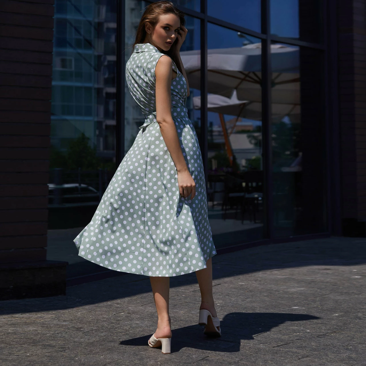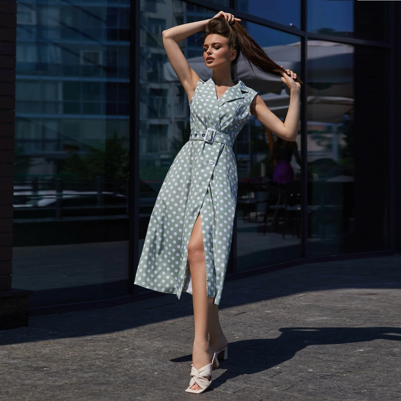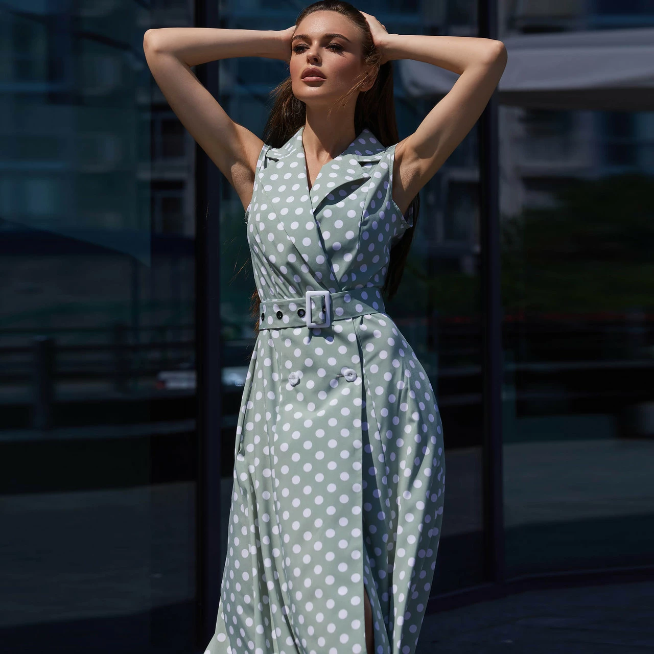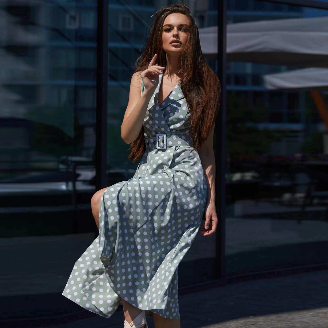Цього сезону як ніколи популярні сукні з принтом у великий горох. Ми представляємо Вашій увазі плаття класичного формату з улюбленим усіма білим горошком у популярних відтінках: червоний, чорний, оливка. Виріб виконаний із тонкого літнього софту, тканина відмінно підходить для спекотної погоди. Комір піджачного типу дозволить підкреслити лінію шиї. У бічних швах передбачено кишені. У комплекті йде пояс із основної тканини із пряжкою.
