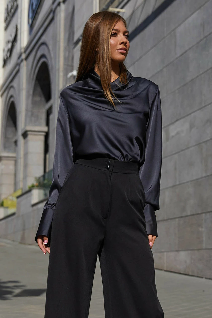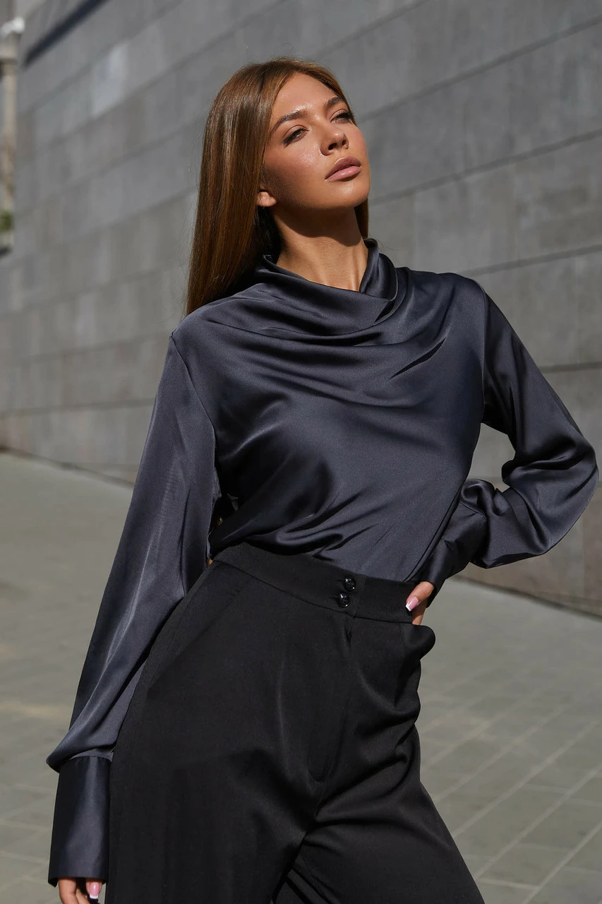 Красивая блуза из шелковой ткани. Горловина изделия выполнена в стиле хомут создавая на груди роскошные волны с блеском ткани. Длинный рукав с высоким манжетом застегивающимся на пуговицу добавляет воздушности. Модель отлично комбинируется с брюками и юбкой, придавая образу делового или вечернего стиля.