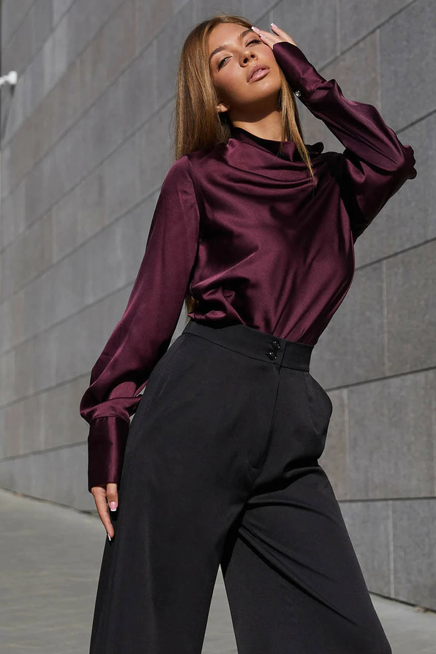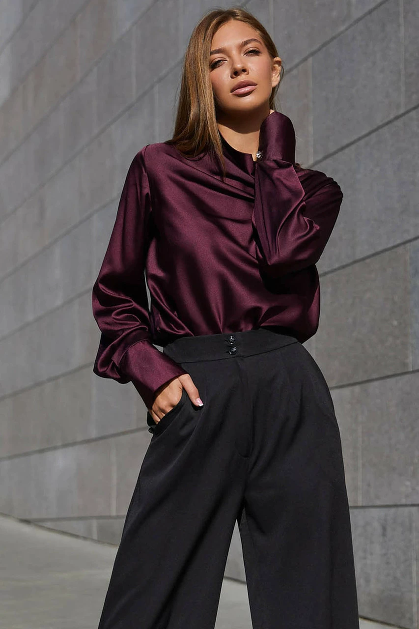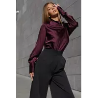 Красивая блуза из шелковой ткани. Горловина изделия выполнена в стиле хомут создавая на груди роскошные волны с блеском ткани. Длинный рукав с высоким манжетом застегивающимся на пуговицу добавляет воздушности. Модель отлично комбинируется с брюками и юбкой, придавая образу делового или вечернего стиля.