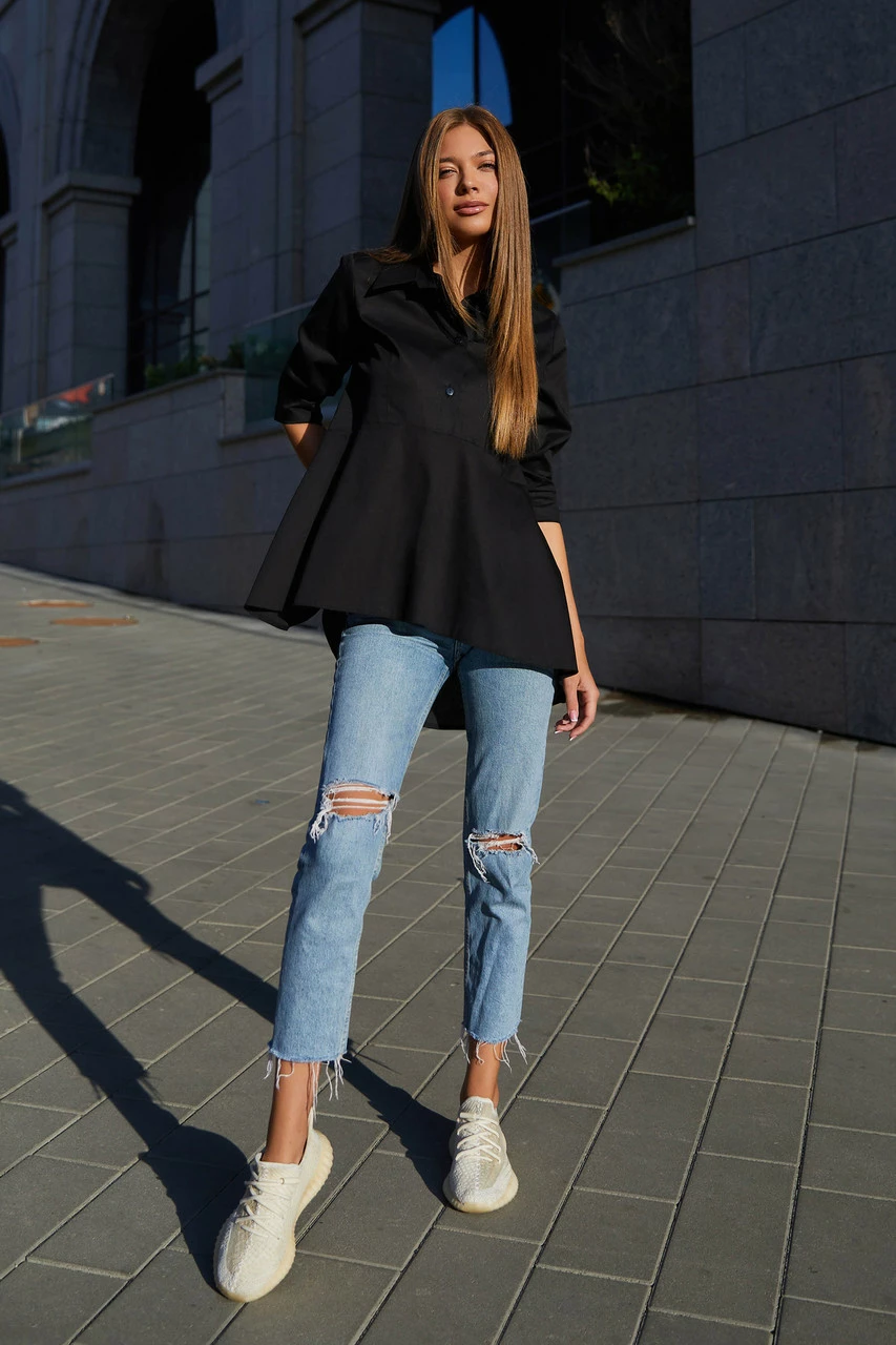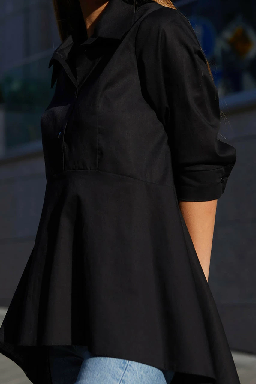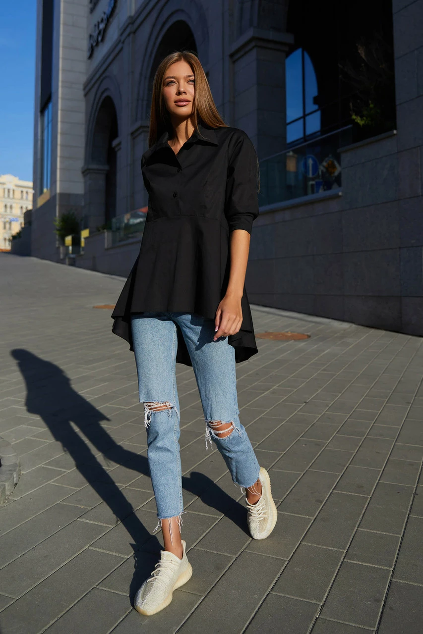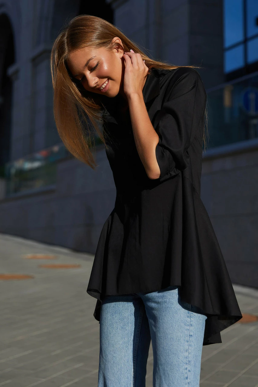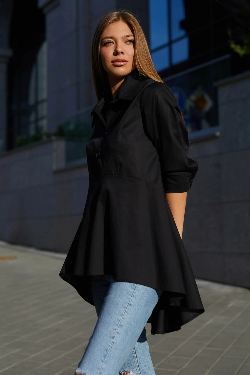 Удивительно женственная рубашка из натуральной ткани, прекрасно подойдет для создания повседневного образа, для офисных будней. Рубашка с кокеткой и с удлинённой спинкой, с фигурным низом, с рукавом в ¾ создаст удивительно кокетливый образ. За счет расклешенного кроя модель подойдет на любую фигуру.