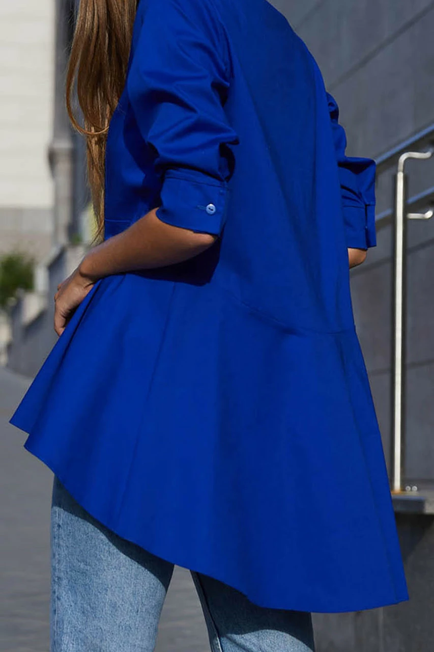 Удивительно женственная рубашка из натуральной ткани, прекрасно подойдет для создания повседневного образа, для офисных будней. Рубашка с кокеткой и с удлинённой спинкой, с фигурным низом, с рукавом в ¾ создаст удивительно кокетливый образ. За счет расклешенного кроя модель подойдет на любую фигуру.
